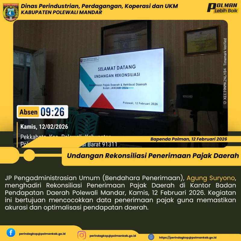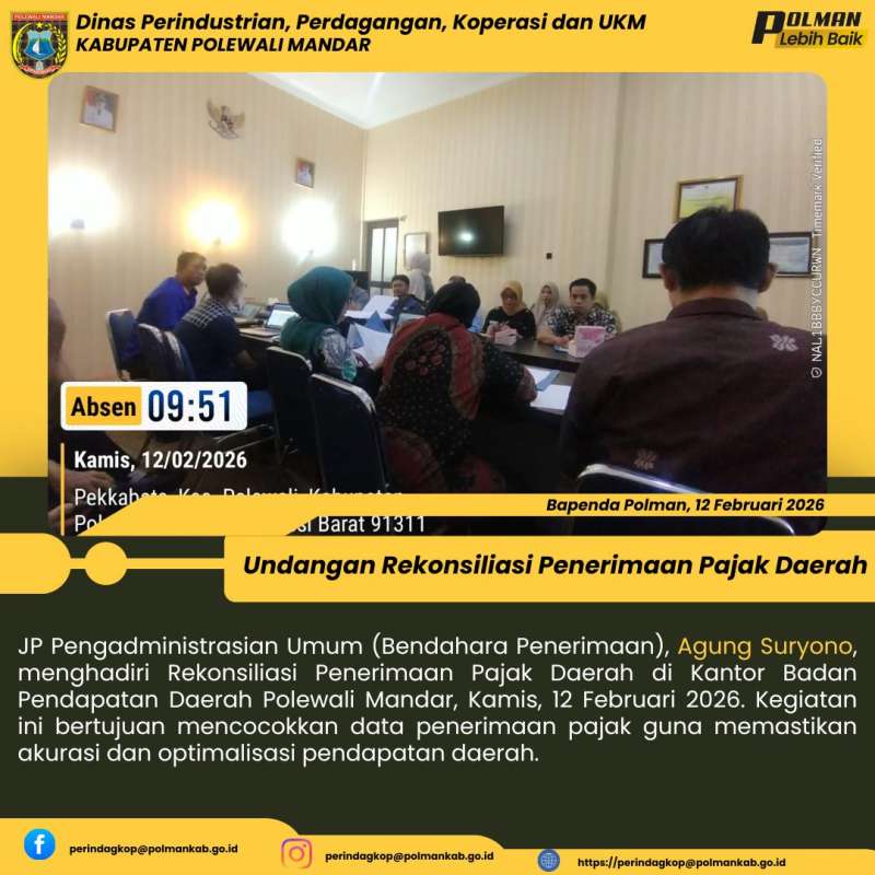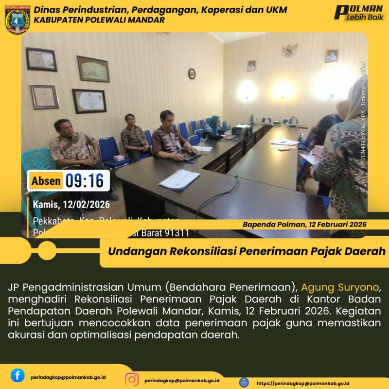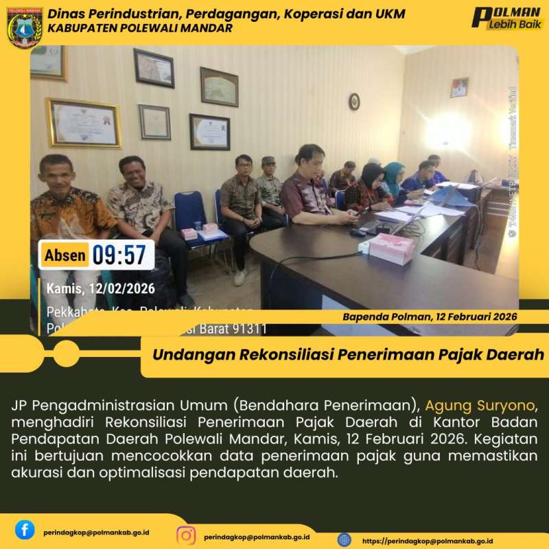 JP Pengadministrasian Umum (Bendahara Penerimaan), Agung Suryono, menghadiri Rekonsiliasi Penerimaan Pajak Daerah di Kantor Badan Pendapatan Daerah Polewali Mandar, Kamis, 12 Februari 2026. Kegiatan ini bertujuan mencocokkan data penerimaan pajak guna memastikan akurasi dan optimalisasi pendapatan daerah.
