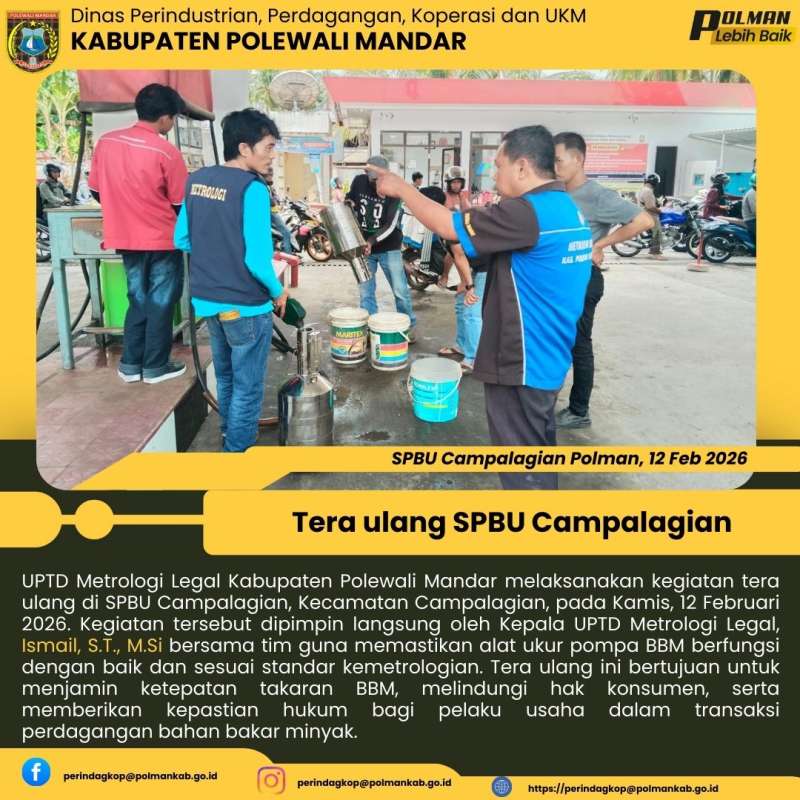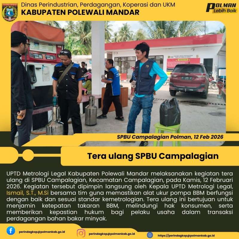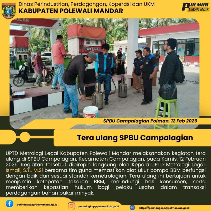 UPTD Metrologi Legal Kabupaten Polewali Mandar melaksanakan kegiatan tera ulang di SPBU Campalagian, Kecamatan Campalagian, pada Kamis, 12 Februari 2026. Kegiatan tersebut dipimpin langsung oleh Kepala UPTD Metrologi Legal, Ismail, S.T., M.Si bersama tim guna memastikan alat ukur pompa BBM berfungsi dengan baik dan sesuai standar kemetrologian. Tera ulang ini bertujuan untuk menjamin ketepatan takaran BBM, melindungi hak konsumen, serta memberikan kepastian hukum bagi pelaku usaha dalam transaksi perdagangan bahan bakar minyak.