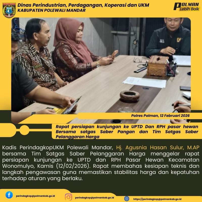 Kadis PerindagkopUKM Polewali Mandar, Hj. Agusnia Hasan Sulur, M.AP bersama Tim Satgas Saber Pelanggaran Harga menggelar rapat persiapan kunjungan ke UPTD dan RPH Pasar Hewan Kecamatan Wonomulyo, Kamis (12/02/2026). Rapat membahas kesiapan teknis dan langkah pengawasan guna memastikan stabilitas harga dan kepatuhan terhadap aturan yang berlaku.