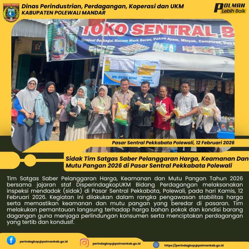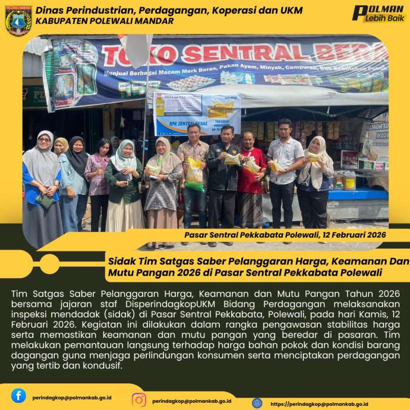 Tim Satgas Saber Pelanggaran Harga, Keamanan dan Mutu Pangan Tahun 2026 bersama jajaran staf DisperindagkopUKM Bidang Perdagangan melaksanakan inspeksi mendadak (sidak) di Pasar Sentral Pekkabata, Polewali, pada hari Kamis, 12 Februari 2026. Kegiatan ini dilakukan dalam rangka pengawasan stabilitas harga serta memastikan keamanan dan mutu pangan yang beredar di pasaran. Tim melakukan pemantauan langsung terhadap harga bahan pokok dan kondisi barang dagangan guna menjaga perlindungan konsumen serta menciptakan perdagangan yang tertib dan kondusif.