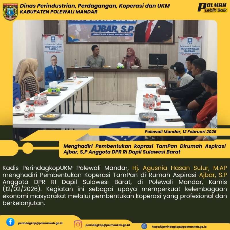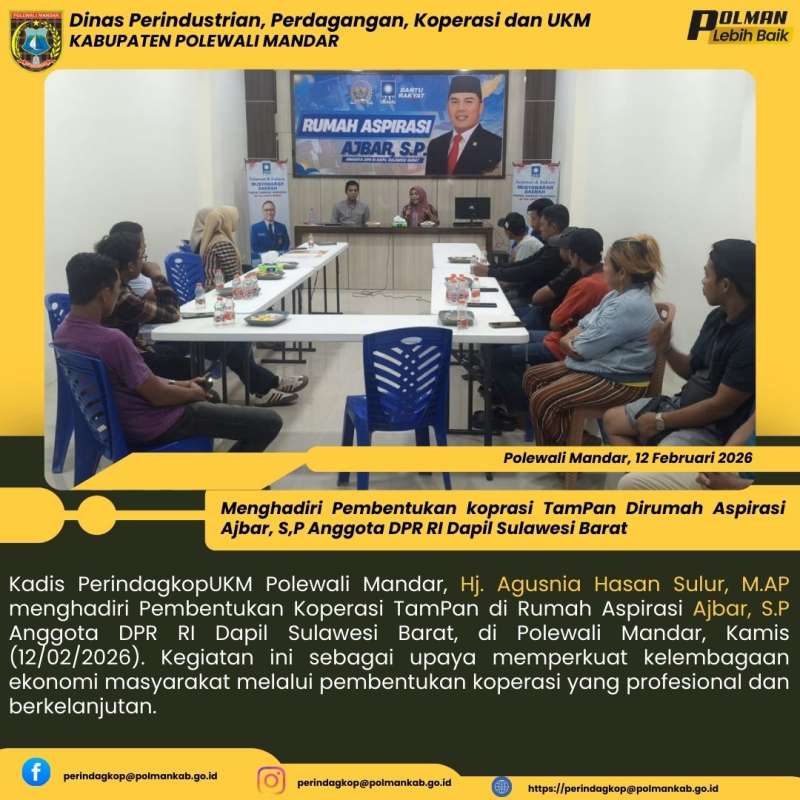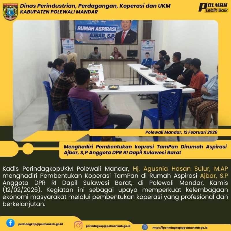 Kadis PerindagkopUKM Polewali Mandar, Hj. Agusnia Hasan Sulur, M.AP menghadiri Pembentukan Koperasi TamPan di Rumah Aspirasi Ajbar, S.P Anggota DPR RI Dapil Sulawesi Barat, di Polewali Mandar, Kamis (12/02/2026). Kegiatan ini sebagai upaya memperkuat kelembagaan ekonomi masyarakat melalui pembentukan koperasi yang profesional dan berkelanjutan.