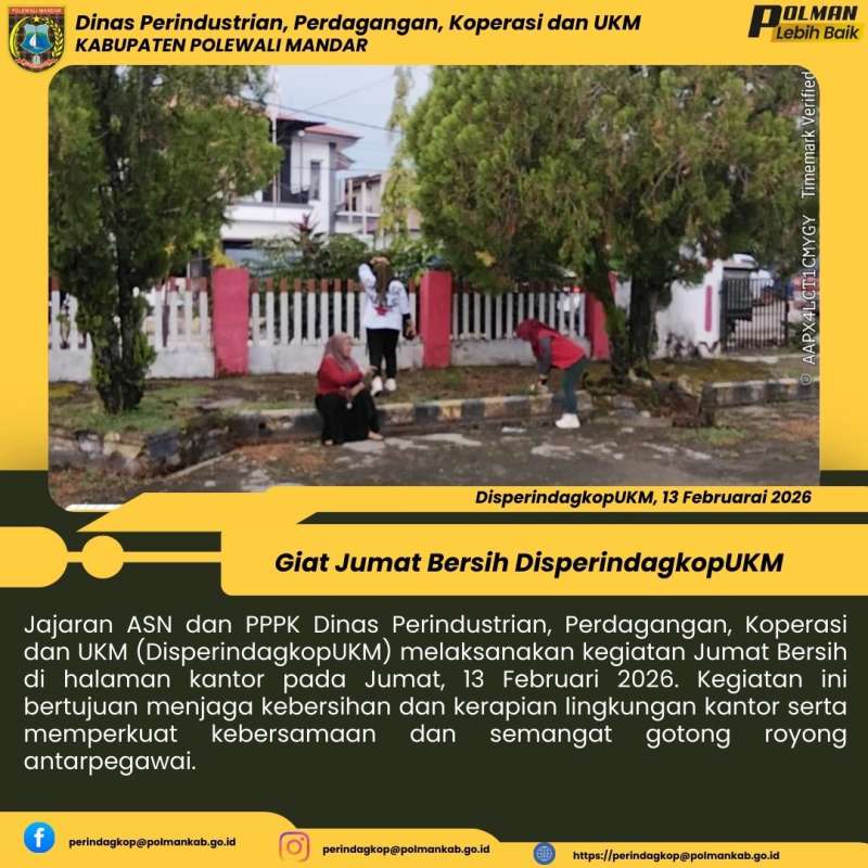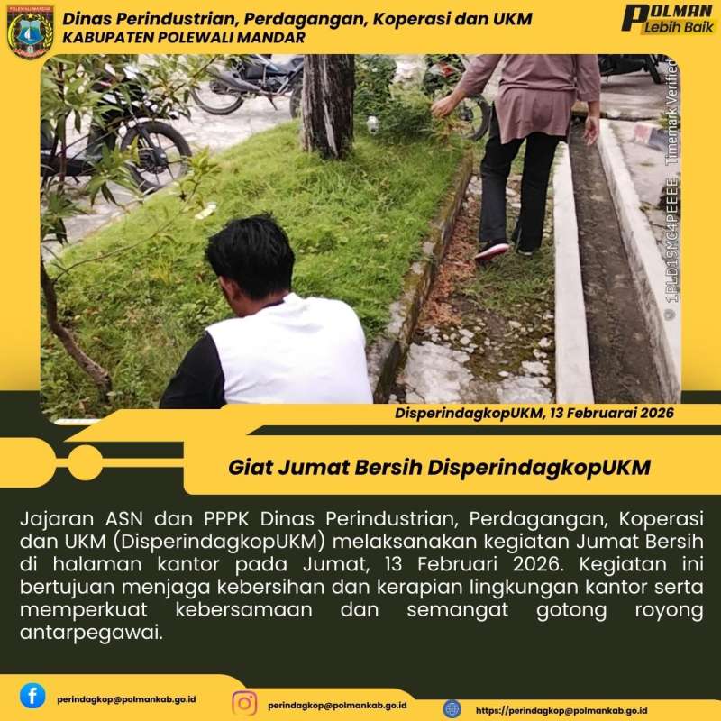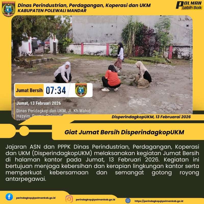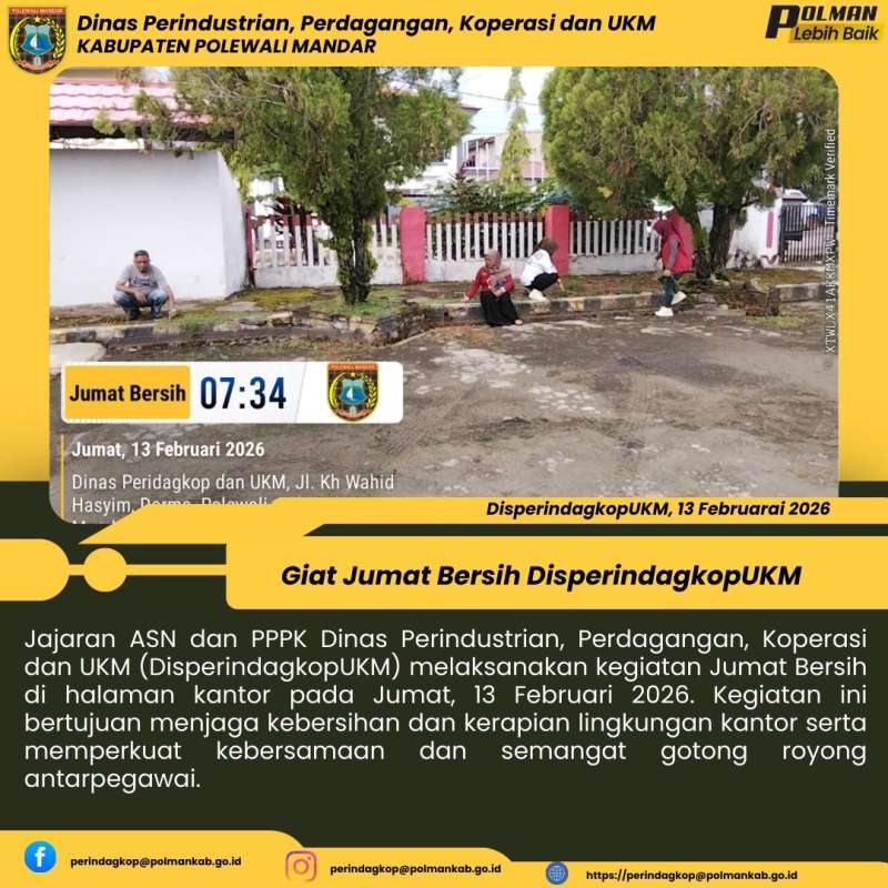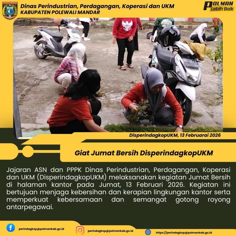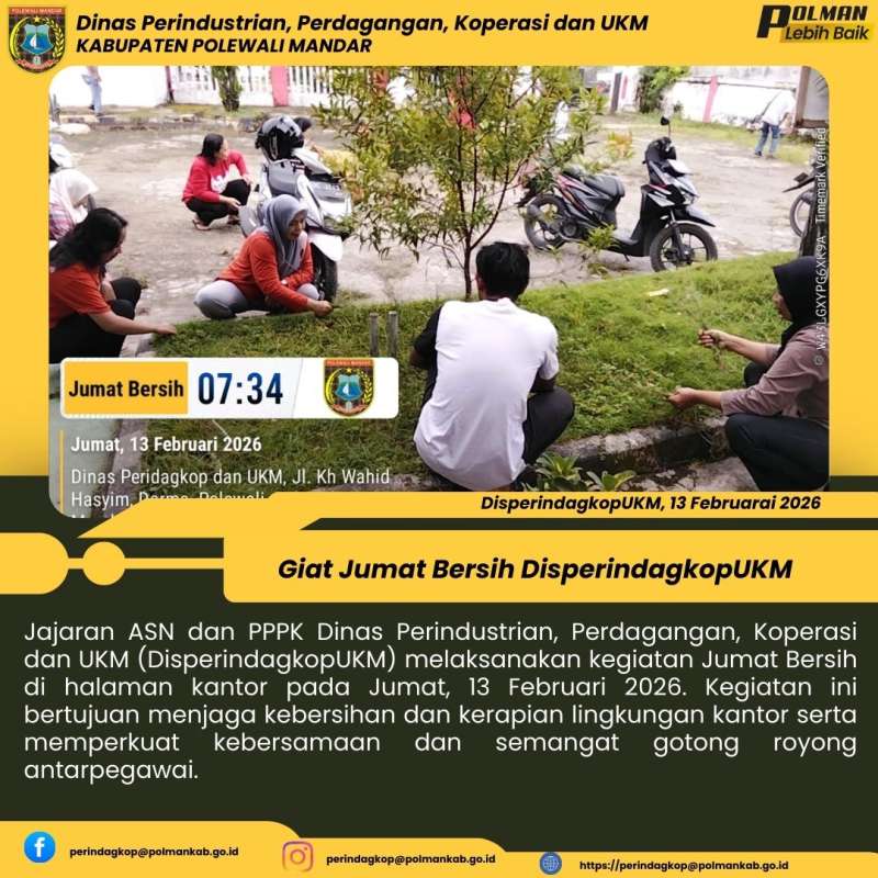 Jajaran ASN dan PPPK Dinas Perindustrian, Perdagangan, Koperasi dan UKM (DisperindagkopUKM) melaksanakan kegiatan Jumat Bersih di halaman kantor pada Jumat, 13 Februari 2026. Kegiatan ini bertujuan menjaga kebersihan dan kerapian lingkungan kantor serta memperkuat kebersamaan dan semangat gotong royong antarpegawai.