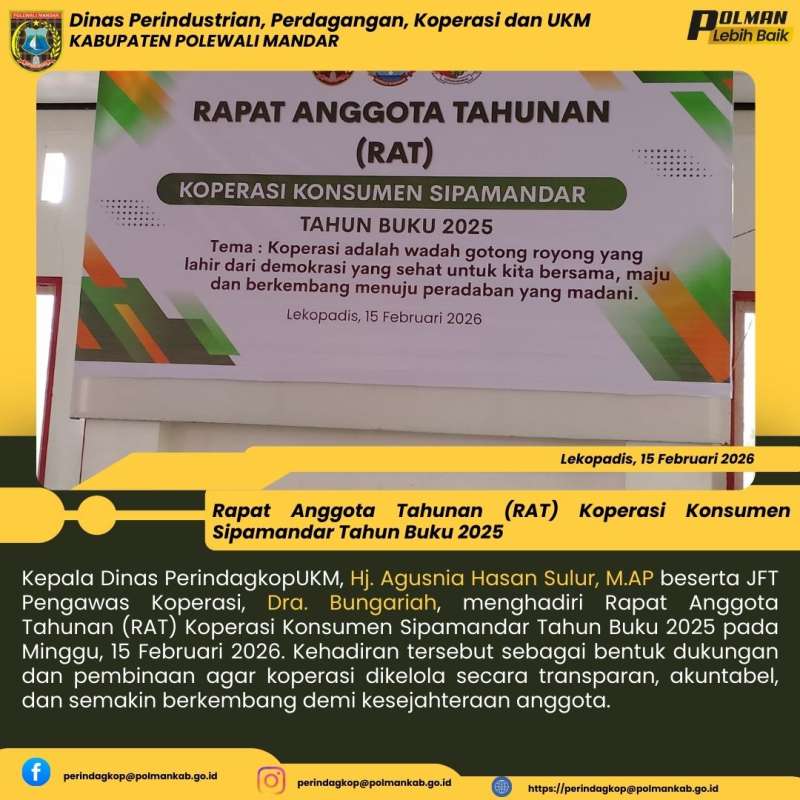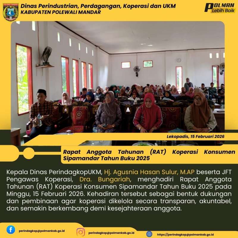 Kepala Dinas PerindagkopUKM, Hj. Agusnia Hasan Sulur, M.AP beserta JFT Pengawas Koperasi, Dra. Bungariah, menghadiri Rapat Anggota Tahunan (RAT) Koperasi Konsumen Sipamandar Tahun Buku 2025 pada Minggu, 15 Februari 2026. Kehadiran tersebut sebagai bentuk dukungan dan pembinaan agar koperasi dikelola secara transparan, akuntabel, dan semakin berkembang demi kesejahteraan anggota.