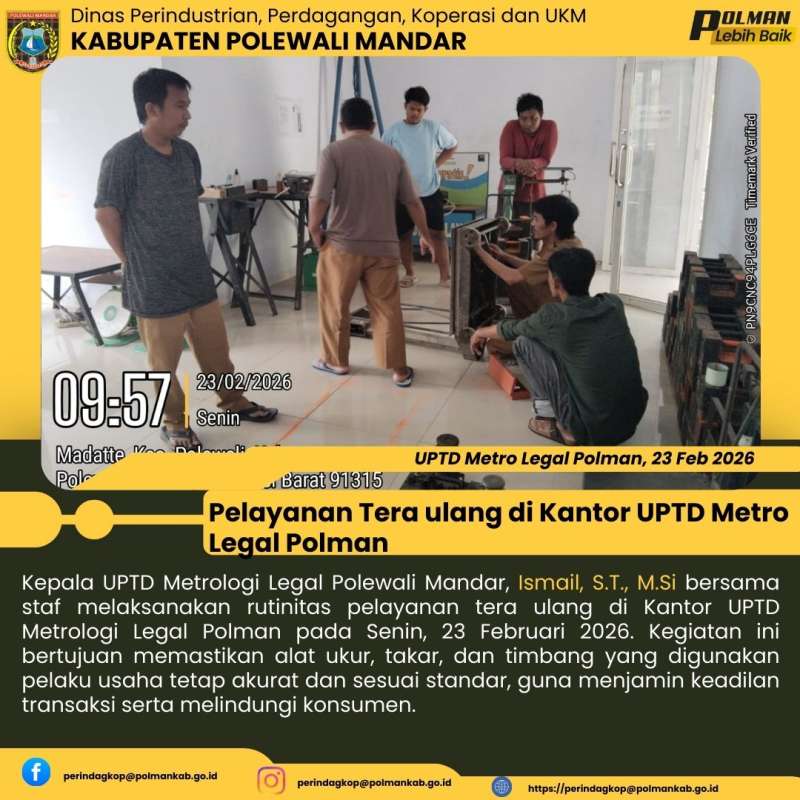 Kepala UPTD Metrologi Legal Polewali Mandar, Ismail, S.T., M.Si bersama staf melaksanakan rutinitas pelayanan tera ulang di Kantor UPTD Metrologi Legal Polman pada Senin, 23 Februari 2026. Kegiatan ini bertujuan memastikan alat ukur, takar, dan timbang yang digunakan pelaku usaha tetap akurat dan sesuai standar, guna menjamin keadilan transaksi serta melindungi konsumen.