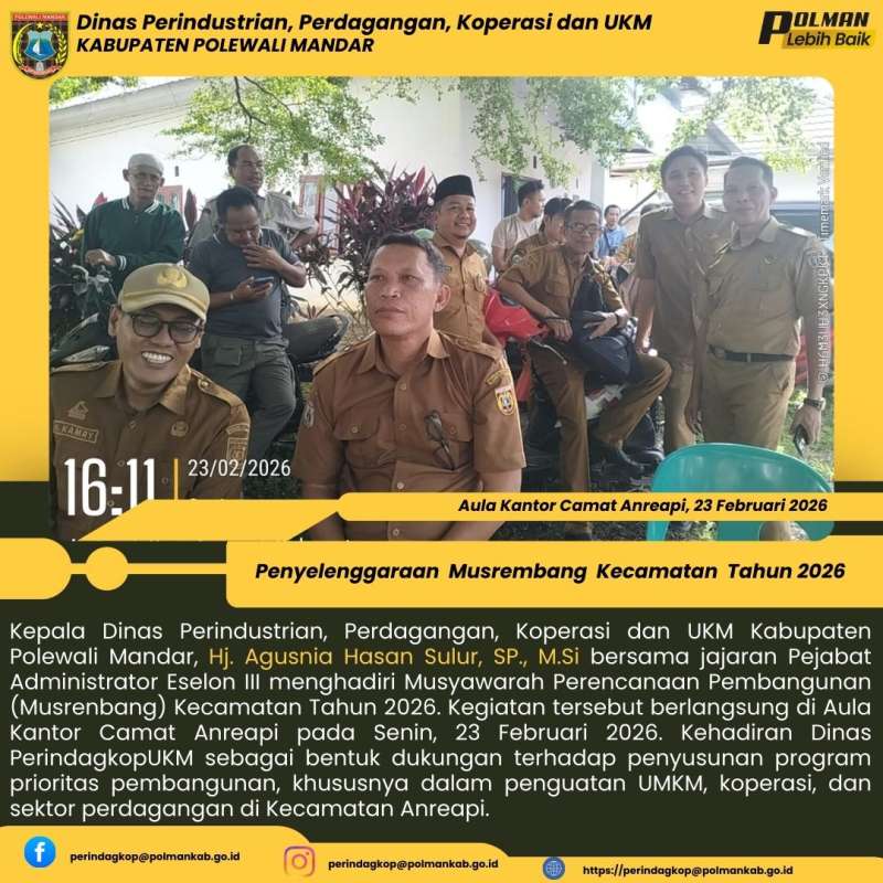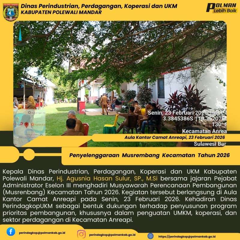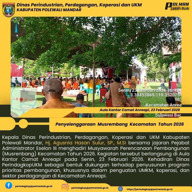 Kepala Dinas Perindustrian, Perdagangan, Koperasi dan UKM Kabupaten Polewali Mandar, Hj. Agusnia Hasan Sulur, SP., M.Si bersama jajaran Pejabat Administrator Eselon III menghadiri Musyawarah Perencanaan Pembangunan (Musrenbang) Kecamatan Tahun 2026. Kegiatan tersebut berlangsung di Aula Kantor Camat Anreapi pada Senin, 23 Februari 2026. Kehadiran Dinas PerindagkopUKM sebagai bentuk dukungan terhadap penyusunan program prioritas pembangunan, khususnya dalam penguatan UMKM, koperasi, dan sektor perdagangan di Kecamatan Anreapi.