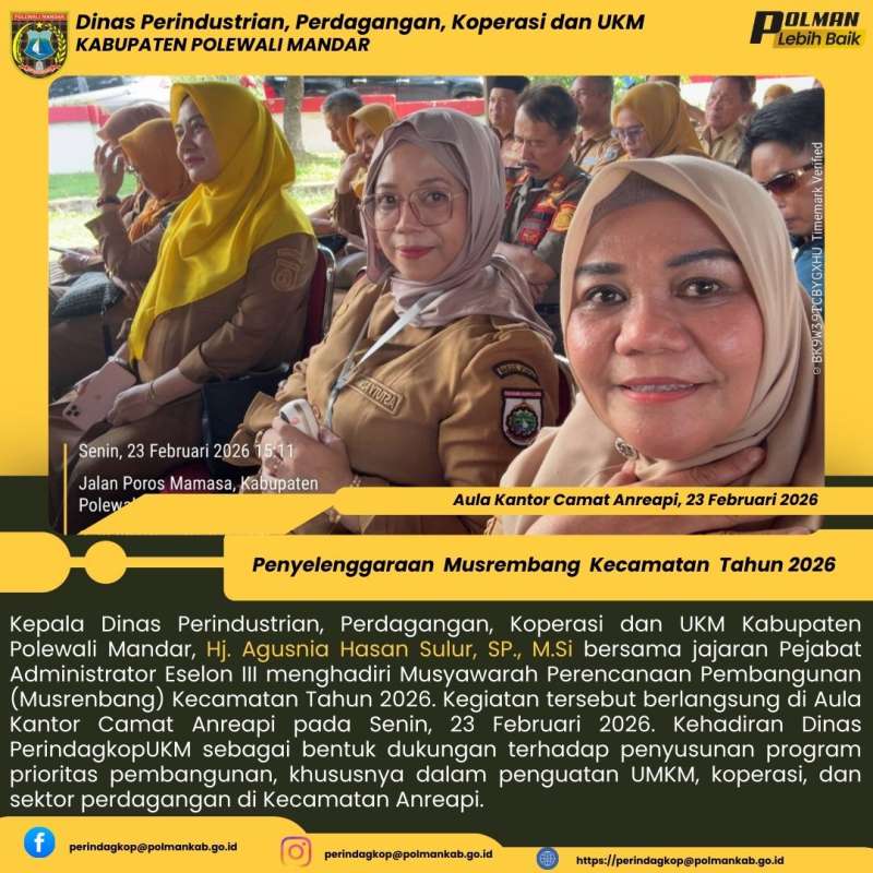 Kepala Dinas Perindustrian, Perdagangan, Koperasi dan UKM Kabupaten Polewali Mandar, Hj. Agusnia Hasan Sulur, SP., M.Si bersama jajaran Pejabat Administrator Eselon III menghadiri Musyawarah Perencanaan Pembangunan (Musrenbang) Kecamatan Tahun 2026. Kegiatan tersebut berlangsung di Aula Kantor Camat Anreapi pada Senin, 23 Februari 2026. Kehadiran Dinas PerindagkopUKM sebagai bentuk dukungan terhadap penyusunan program prioritas pembangunan, khususnya dalam penguatan UMKM, koperasi, dan sektor perdagangan di Kecamatan Anreapi.