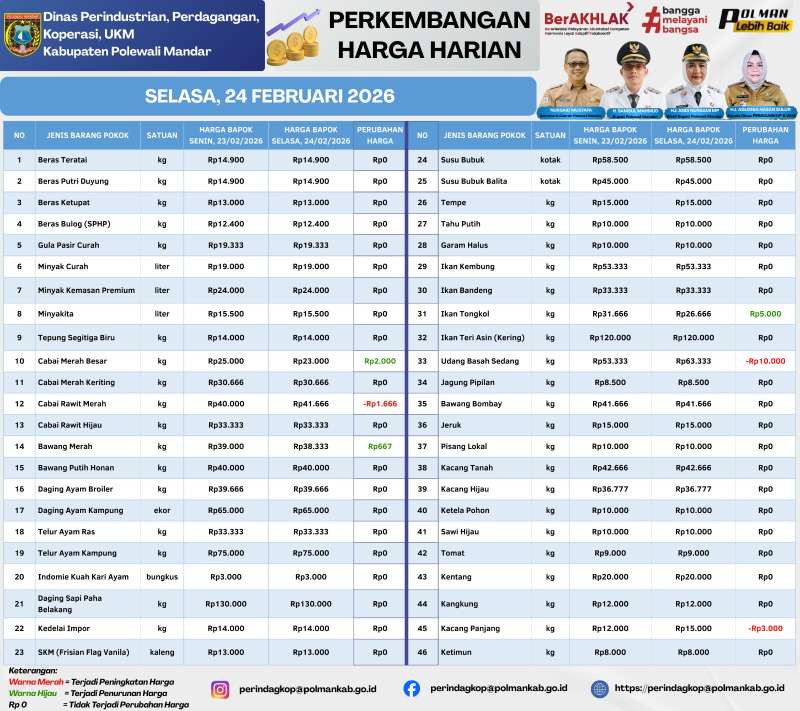 Hasil pantauan menunjukkan harga cabai rawit merah mengalami kenaikan, sementara cabai merah besar dan bawang merah mengalami penurunan. Stok kebutuhan pokok lainnya terpantau aman.