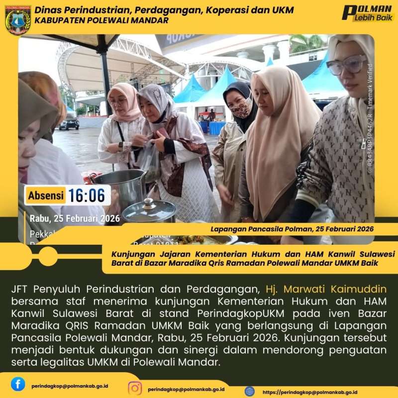 JFT Penyuluh Perindustrian dan Perdagangan, Hj. Marwati Kaimuddin bersama staf menerima kunjungan Kementerian Hukum dan HAM Kanwil Sulawesi Barat di stand PerindagkopUKM pada iven Bazar Maradika QRIS Ramadan UMKM Baik yang berlangsung di Lapangan Pancasila Polewali Mandar, Rabu, 25 Februari 2026. Kunjungan tersebut menjadi bentuk dukungan dan sinergi dalam mendorong penguatan serta legalitas UMKM di Polewali Mandar.