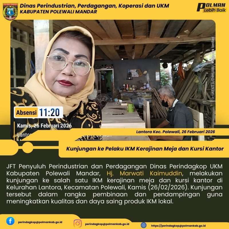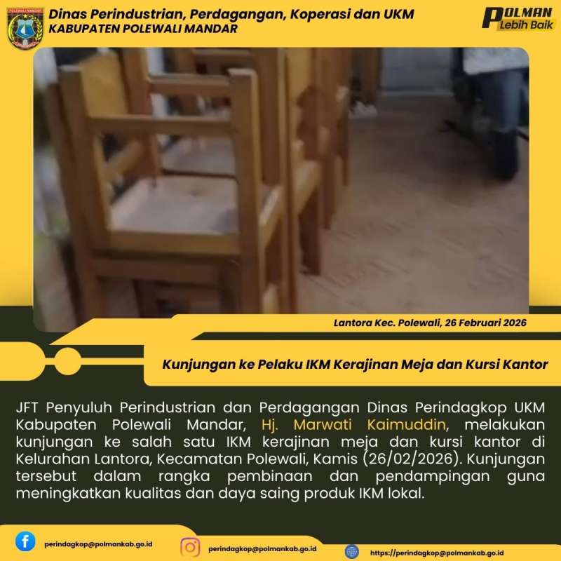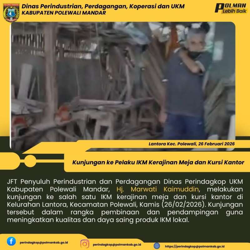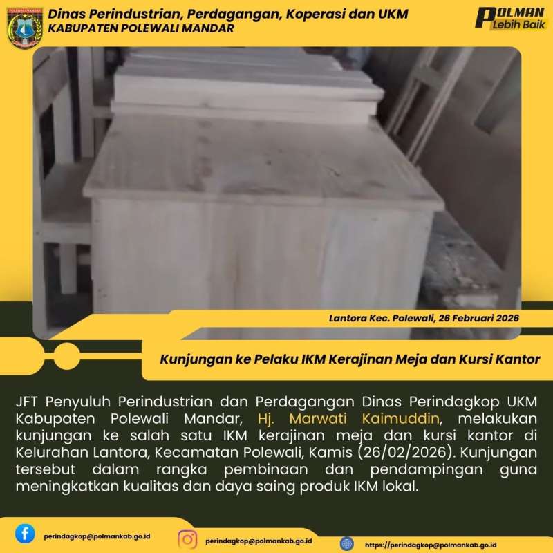 JFT Penyuluh Perindustrian dan Perdagangan Dinas Perindagkop UKM Kabupaten Polewali Mandar, Hj. Marwati Kaimuddin, melakukan kunjungan ke salah satu IKM kerajinan meja dan kursi kantor di Kelurahan Lantora, Kecamatan Polewali, Kamis (26/02/2026). Kunjungan tersebut dalam rangka pembinaan dan pendampingan guna meningkatkan kualitas dan daya saing produk IKM lokal.