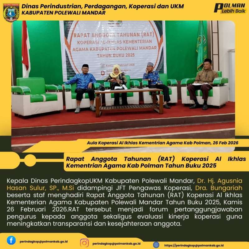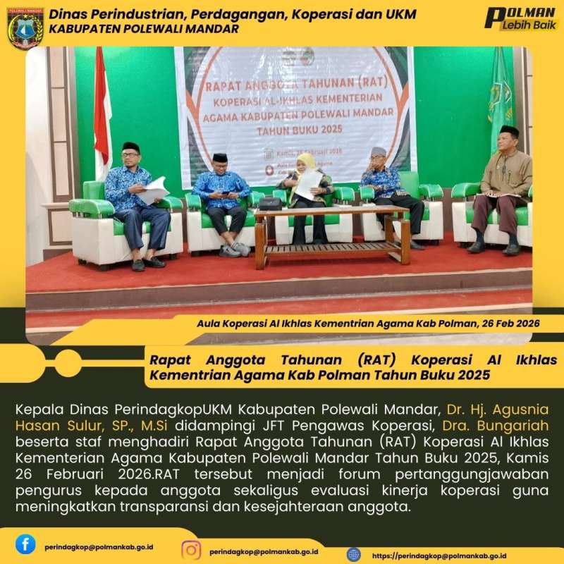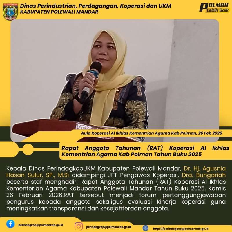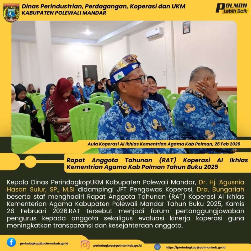Kepala Dinas PerindagkopUKM Kabupaten Polewali Mandar, Dr. Hj. Agusnia Hasan Sulur, SP., M.Si didampingi JFT Pengawas Koperasi, Dra. Bungariah beserta staf menghadiri Rapat Anggota Tahunan (RAT) Koperasi Al Ikhlas Kementerian Agama Kabupaten Polewali Mandar Tahun Buku 2025, Kamis 26 Februari 2026.RAT tersebut menjadi forum pertanggungjawaban pengurus kepada anggota sekaligus evaluasi kinerja koperasi guna meningkatkan transparansi dan kesejahteraan anggota.