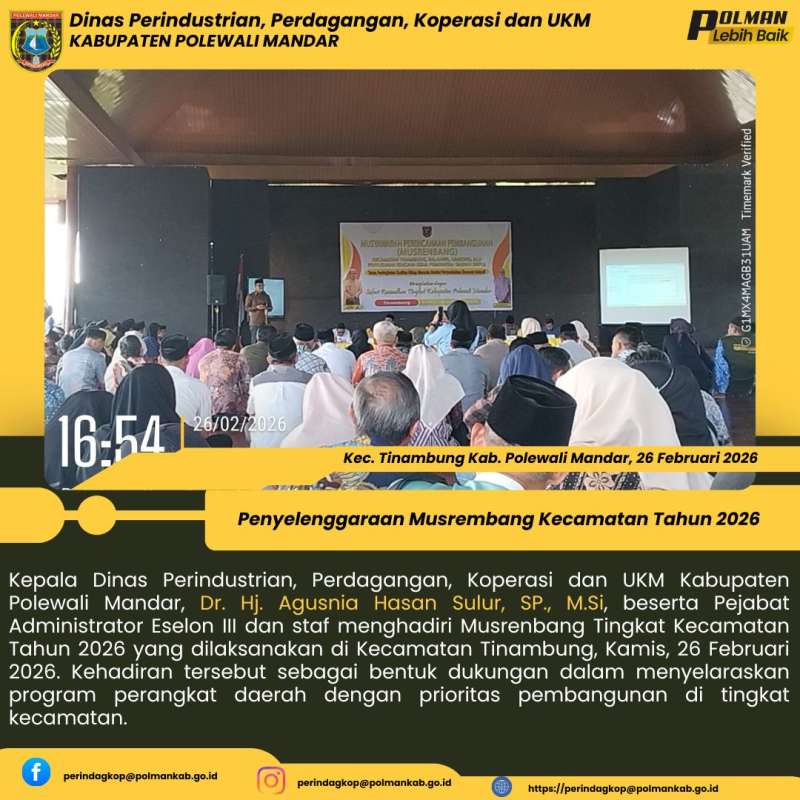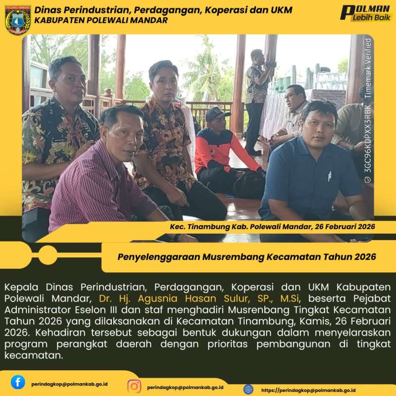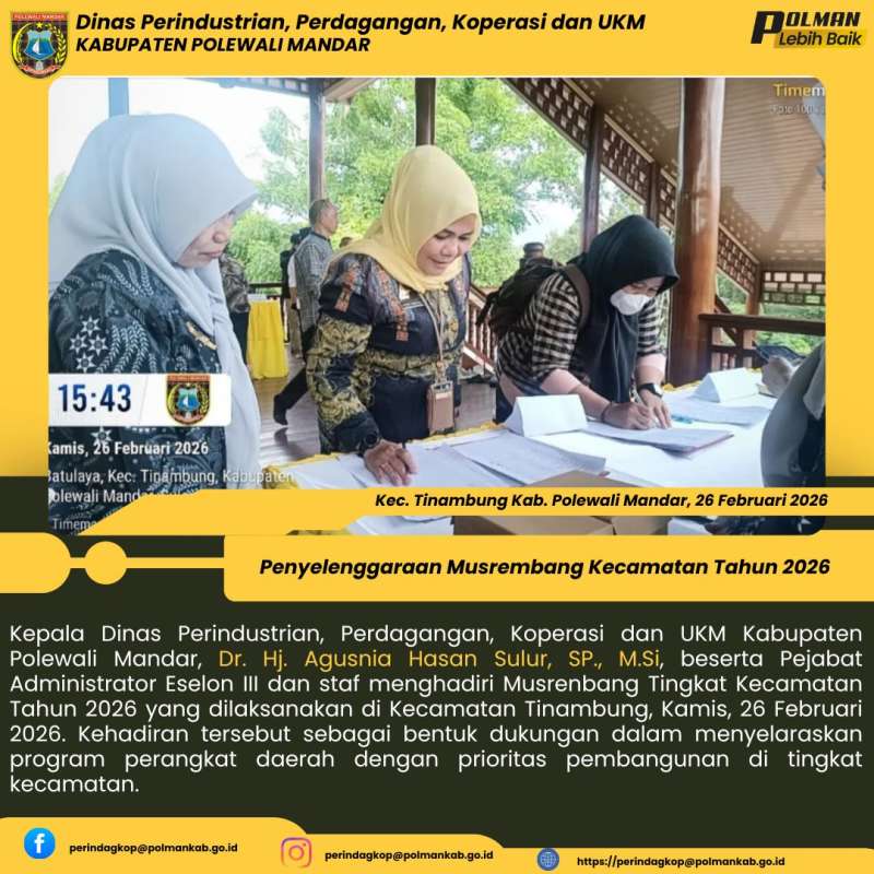 Kepala Dinas Perindustrian, Perdagangan, Koperasi dan UKM Kabupaten Polewali Mandar, Dr. Hj. Agusnia Hasan Sulur, SP., M.Si, beserta Pejabat Administrator Eselon III dan staf menghadiri Musrenbang Tingkat Kecamatan Tahun 2026 yang dilaksanakan di Kecamatan Tinambung, Kamis, 26 Februari 2026. Kehadiran tersebut sebagai bentuk dukungan dalam menyelaraskan program perangkat daerah dengan prioritas pembangunan di tingkat kecamatan.