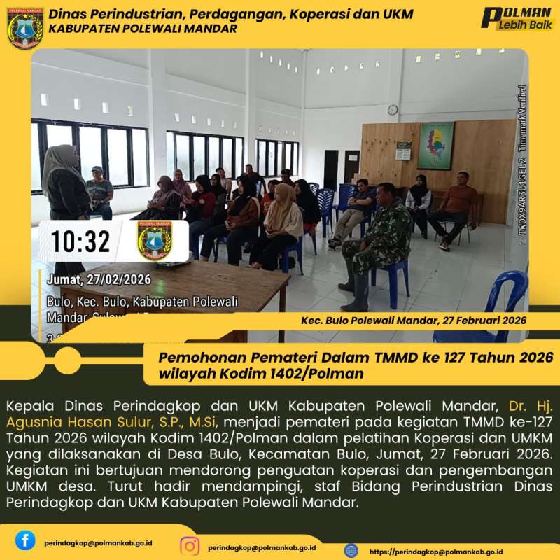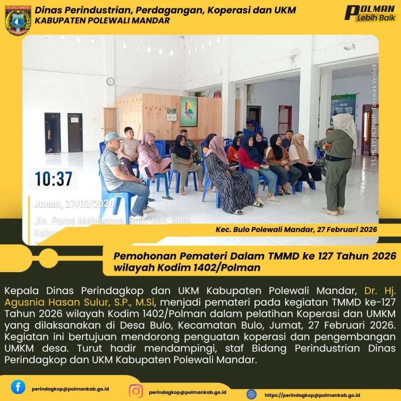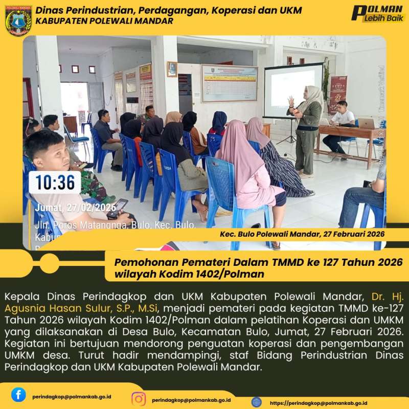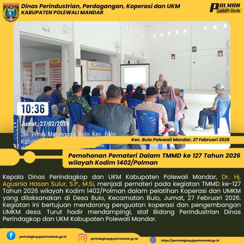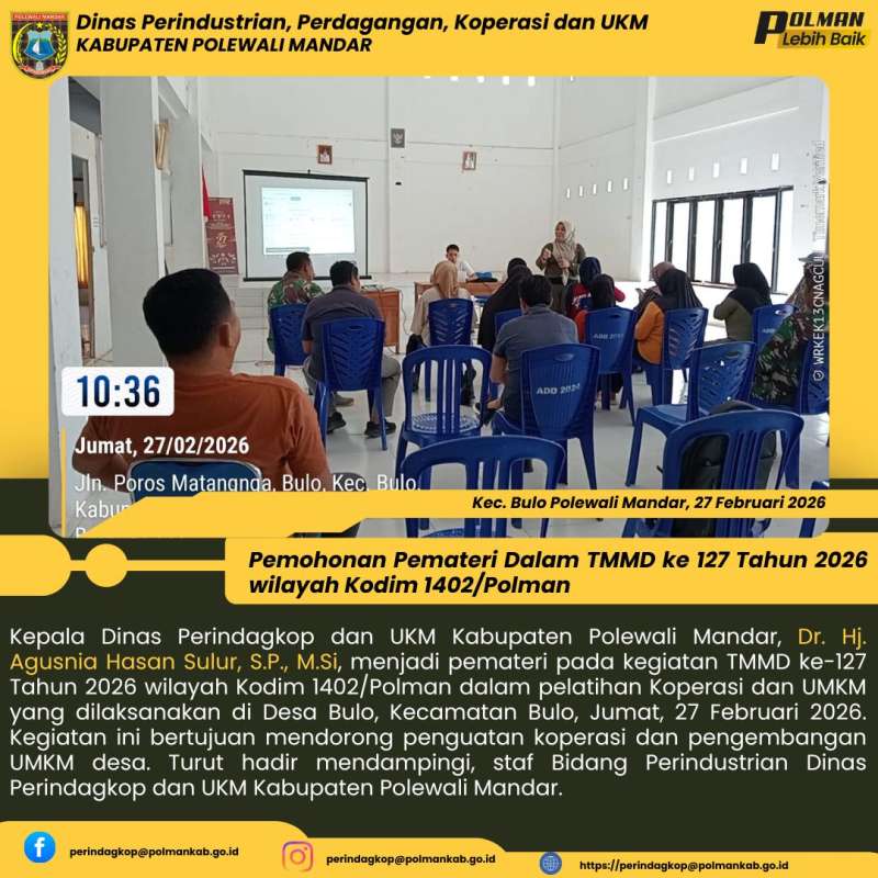 Kepala Dinas Perindagkop dan UKM Kabupaten Polewali Mandar, Dr. Hj. Agusnia Hasan Sulur, S.P., M.Si, menjadi pemateri pada kegiatan TMMD ke-127 Tahun 2026 wilayah Kodim 1402/Polman dalam pelatihan Koperasi dan UMKM yang dilaksanakan di Desa Bulo, Kecamatan Bulo, Jumat, 27 Februari 2026. Kegiatan ini bertujuan mendorong penguatan koperasi dan pengembangan UMKM desa. Turut hadir mendampingi, staf Bidang Perindustrian Dinas Perindagkop dan UKM Kabupaten Polewali Mandar.