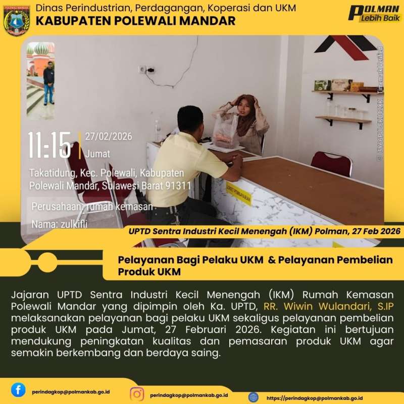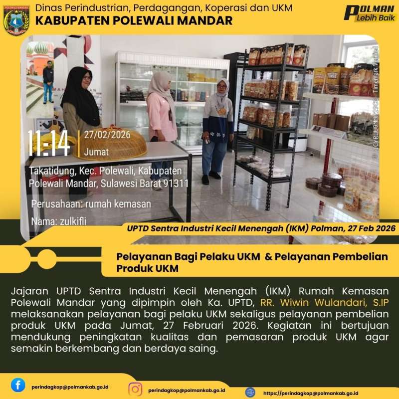 Jajaran UPTD Sentra Industri Kecil Menengah (IKM) Rumah Kemasan Polewali Mandar yang dipimpin oleh Ka. UPTD, RR. Wiwin Wulandari, S.IP melaksanakan pelayanan bagi pelaku UKM sekaligus pelayanan pembelian produk UKM pada Jumat, 27 Februari 2026. Kegiatan ini bertujuan mendukung peningkatan kualitas dan pemasaran produk UKM agar semakin berkembang dan berdaya saing.