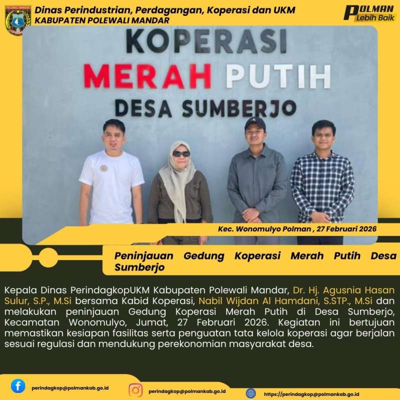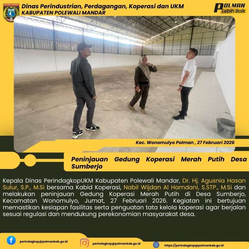 Kepala Dinas PerindagkopUKM Kabupaten Polewali Mandar, Dr. Hj. Agusnia Hasan Sulur, S.P., M.Si bersama Kabid Koperasi, Nabil Wijdan Al Hamdani, S.STP., M.Si dan melakukan peninjauan Gedung Koperasi Merah Putih di Desa Sumberjo, Kecamatan Wonomulyo, Jumat, 27 Februari 2026. Kegiatan ini bertujuan memastikan kesiapan fasilitas serta penguatan tata kelola koperasi agar berjalan sesuai regulasi dan mendukung perekonomian masyarakat desa.