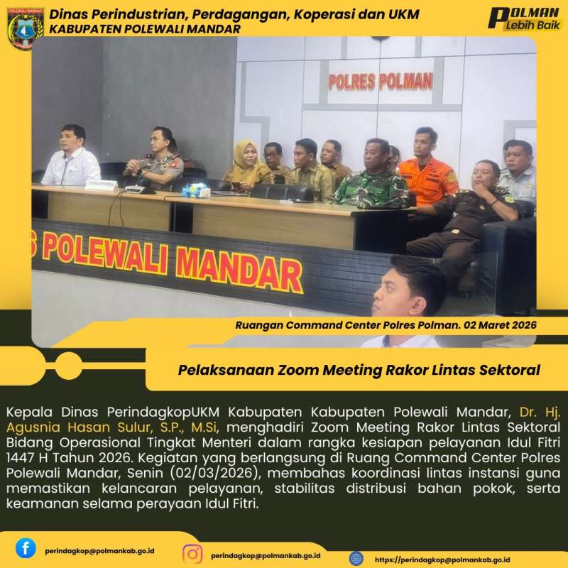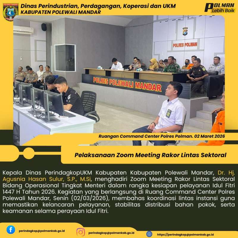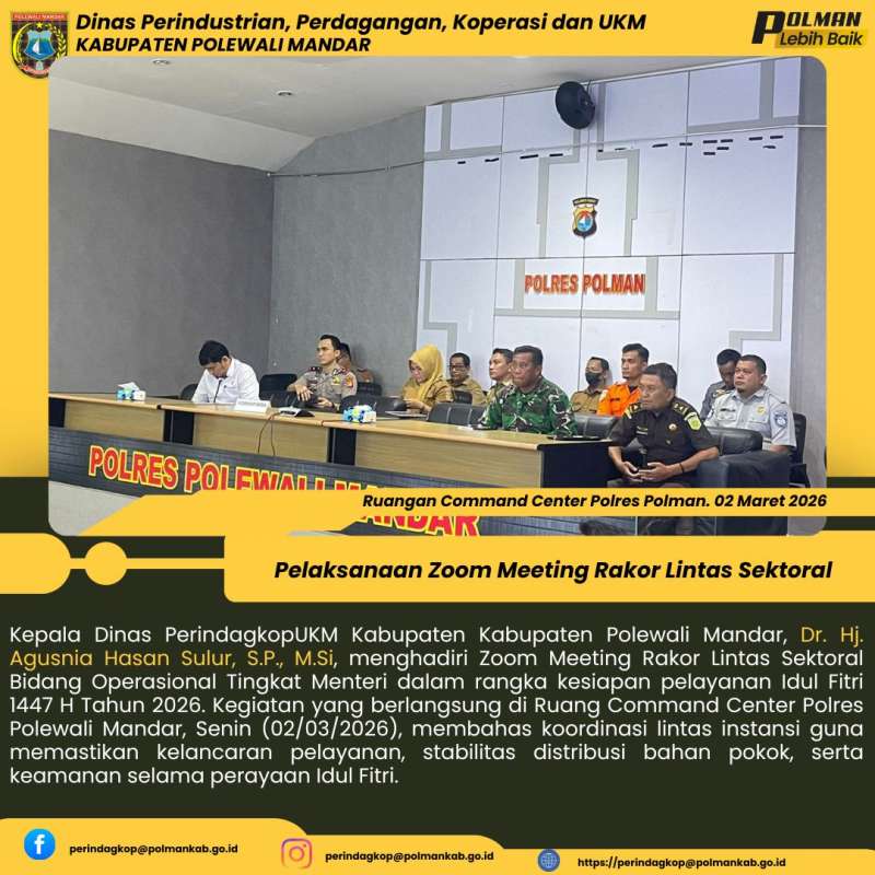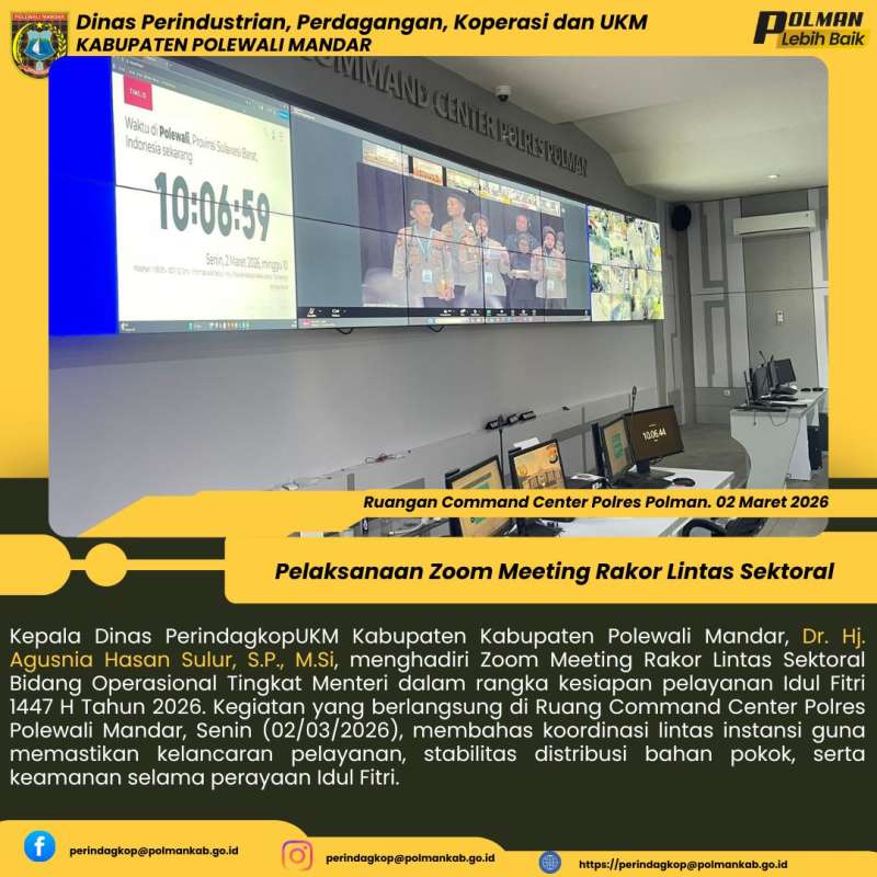 Kepala Dinas PerindagkopUKM Kabupaten Kabupaten Polewali Mandar, Dr. Hj. Agusnia Hasan Sulur, S.P., M.Si, menghadiri Zoom Meeting Rakor Lintas Sektoral Bidang Operasional Tingkat Menteri dalam rangka kesiapan pelayanan Idul Fitri 1447 H Tahun 2026. Kegiatan yang berlangsung di Ruang Command Center Polres Polewali Mandar, Senin (02/03/2026), membahas koordinasi lintas instansi guna memastikan kelancaran pelayanan, stabilitas distribusi bahan pokok, serta keamanan selama perayaan Idul Fitri.