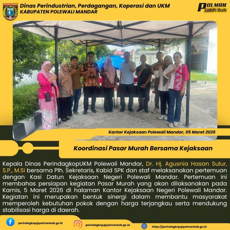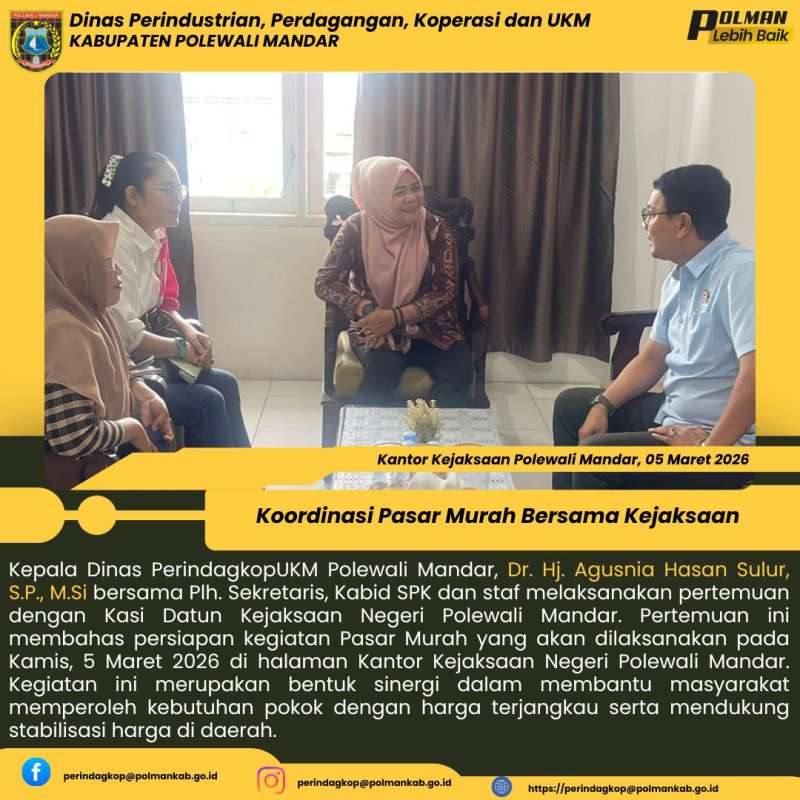 Kepala Dinas PerindagkopUKM Polewali Mandar, Dr. Hj. Agusnia Hasan Sulur, S.P., M.Si bersama Plh. Sekretaris, Kabid SPK dan staf melaksanakan pertemuan dengan Kasi Datun Kejaksaan Negeri Polewali Mandar. Pertemuan ini membahas persiapan kegiatan Pasar Murah yang akan dilaksanakan pada Kamis, 5 Maret 2026 di halaman Kantor Kejaksaan Negeri Polewali Mandar. Kegiatan ini merupakan bentuk sinergi dalam membantu masyarakat memperoleh kebutuhan pokok dengan harga terjangkau serta mendukung stabilisasi harga di daerah.