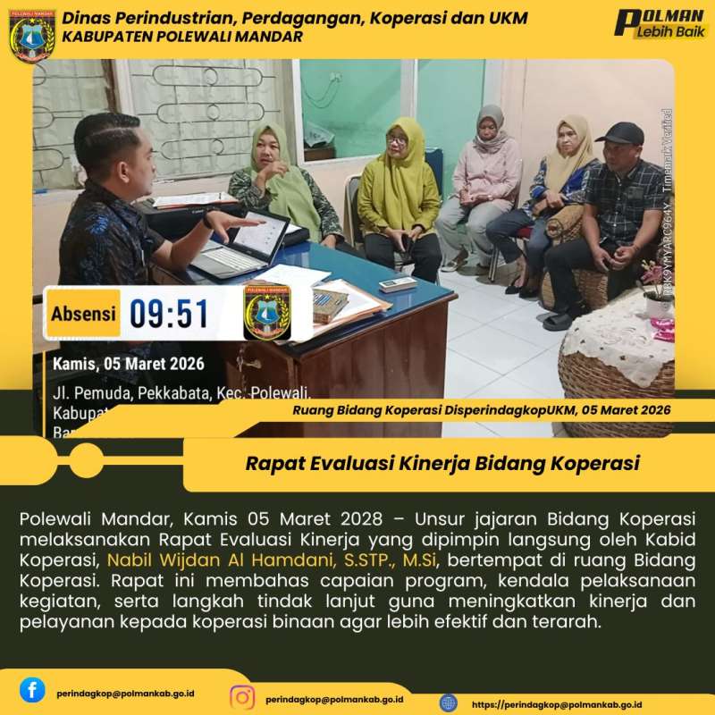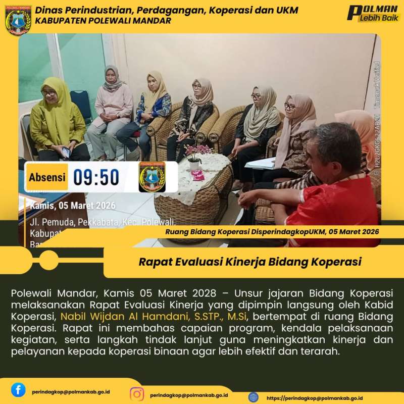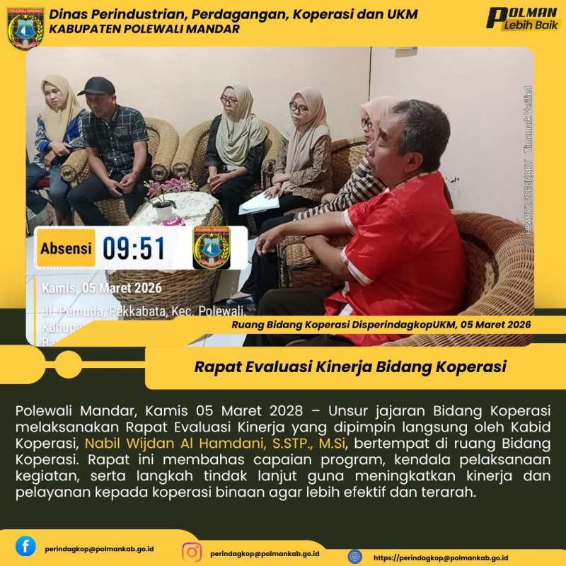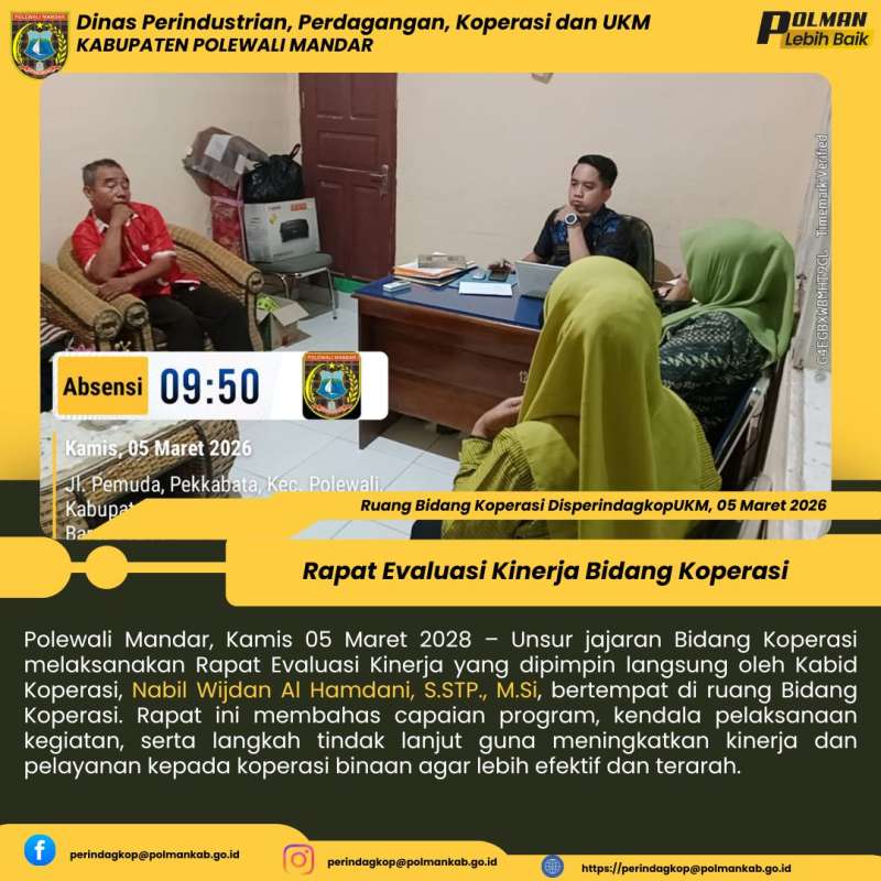 Polewali Mandar, Kamis 05 Maret 2028 – Unsur jajaran Bidang Koperasi melaksanakan Rapat Evaluasi Kinerja yang dipimpin langsung oleh Kabid Koperasi, Nabil Wijdan Al Hamdani, S.STP., M.Si, bertempat di ruang Bidang Koperasi. Rapat ini membahas capaian program, kendala pelaksanaan kegiatan, serta langkah tindak lanjut guna meningkatkan kinerja dan pelayanan kepada koperasi binaan agar lebih efektif dan terarah.