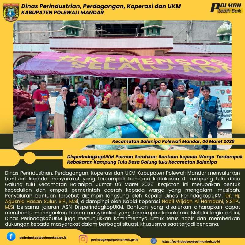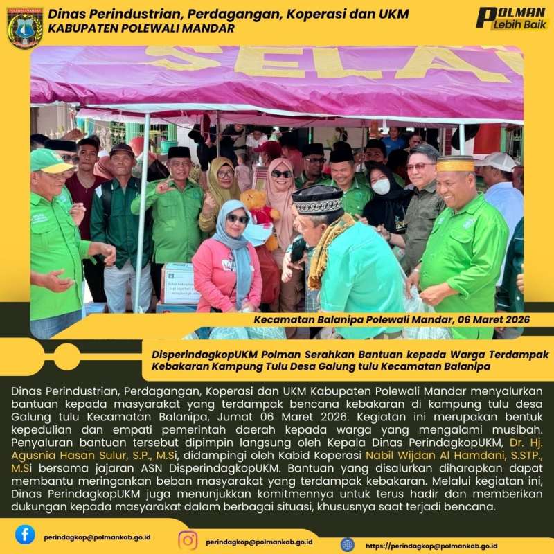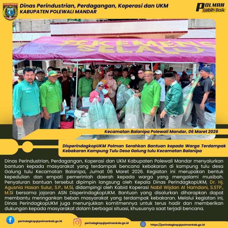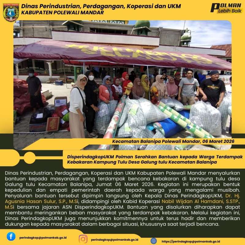 Dinas Perindustrian, Perdagangan, Koperasi dan UKM Kabupaten Polewali Mandar menyalurkan bantuan kepada masyarakat yang terdampak bencana kebakaran di kampung tulu desa Galung tulu Kecamatan Balanipa, Jumat 06 Maret 2026. Kegiatan ini merupakan bentuk kepedulian dan empati pemerintah daerah kepada warga yang mengalami musibah. Penyaluran bantuan tersebut dipimpin langsung oleh Kepala Dinas PerindagkopUKM, Dr. Hj. Agusnia Hasan Sulur, S.P., M.Si, didampingi oleh Kabid Koperasi Nabil Wijdan Al Hamdani, S.STP., M.Si bersama jajaran ASN DisperindagkopUKM. Bantuan yang disalurkan diharapkan dapat membantu meringankan beban masyarakat yang terdampak kebakaran. Melalui kegiatan ini, Dinas PerindagkopUKM juga menunjukkan komitmennya untuk terus hadir dan memberikan dukungan kepada masyarakat dalam berbagai situasi, khususnya saat terjadi bencana.
