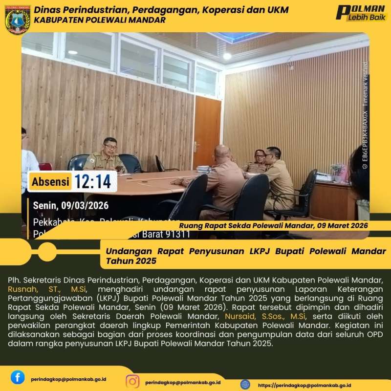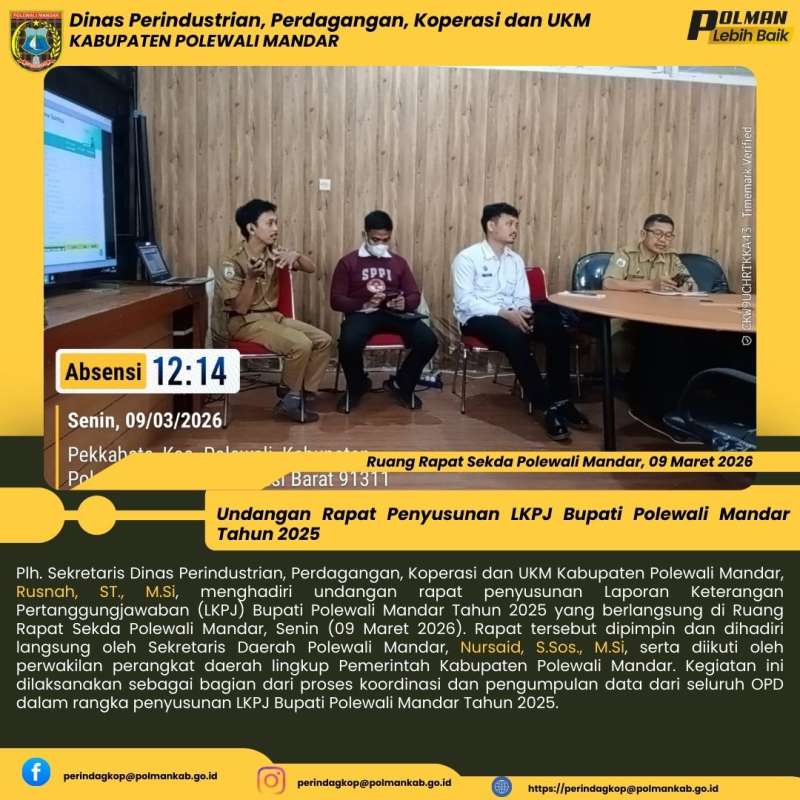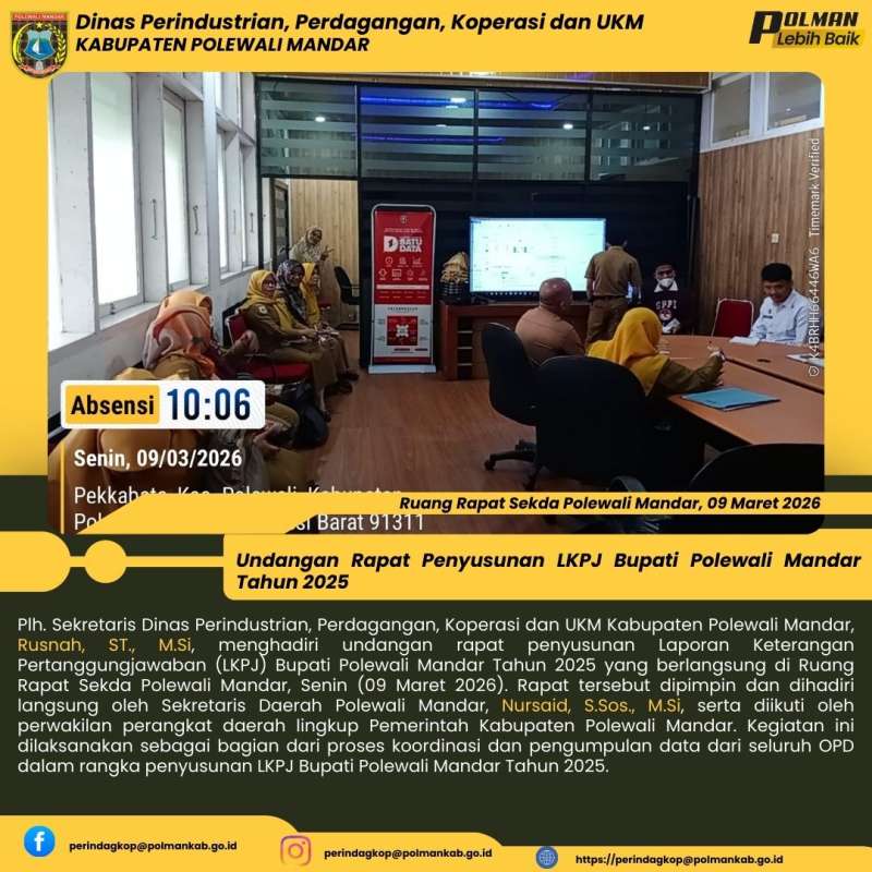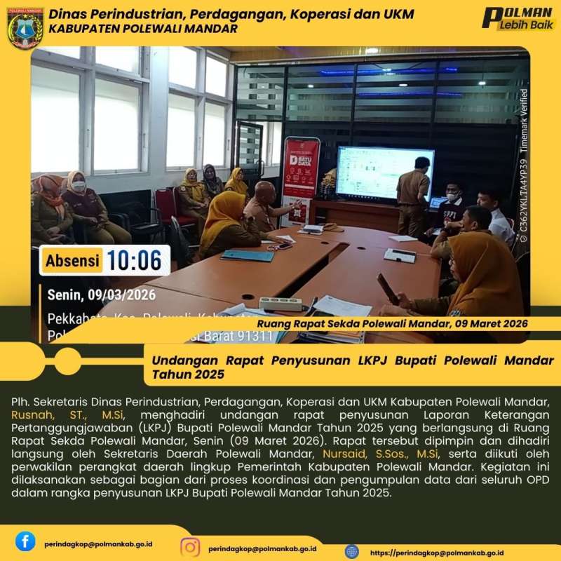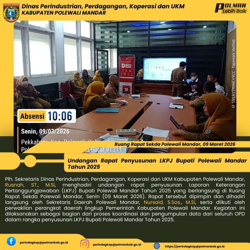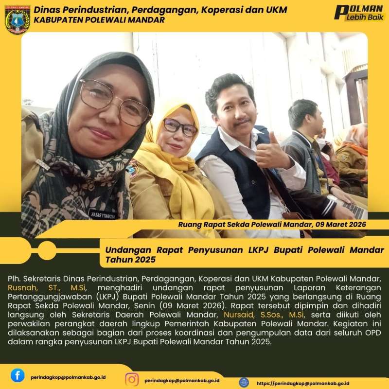 Plh. Sekretaris Dinas Perindustrian, Perdagangan, Koperasi dan UKM Kabupaten Polewali Mandar, Rusnah, ST., M.Si, menghadiri undangan rapat penyusunan Laporan Keterangan Pertanggungjawaban (LKPJ) Bupati Polewali Mandar Tahun 2025 yang berlangsung di Ruang Rapat Sekda Polewali Mandar, Senin (09 Maret 2026). Rapat tersebut dipimpin dan dihadiri langsung oleh Sekretaris Daerah Polewali Mandar, Nursaid, S.Sos., M.Si, serta diikuti oleh perwakilan perangkat daerah lingkup Pemerintah Kabupaten Polewali Mandar. Kegiatan ini dilaksanakan sebagai bagian dari proses koordinasi dan pengumpulan data dari seluruh OPD dalam rangka penyusunan LKPJ Bupati Polewali Mandar Tahun 2025.