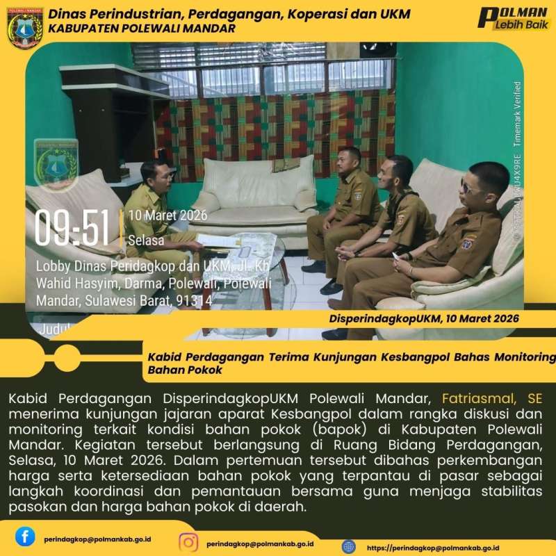 Kabid Perdagangan DisperindagkopUKM Polewali Mandar, Fatriasmal, SE menerima kunjungan jajaran aparat Kesbangpol dalam rangka diskusi dan monitoring terkait kondisi bahan pokok (bapok) di Kabupaten Polewali Mandar. Kegiatan tersebut berlangsung di Ruang Bidang Perdagangan, Selasa, 10 Maret 2026. Dalam pertemuan tersebut dibahas perkembangan harga serta ketersediaan bahan pokok yang terpantau di pasar sebagai langkah koordinasi dan pemantauan bersama guna menjaga stabilitas pasokan dan harga bahan pokok di daerah.