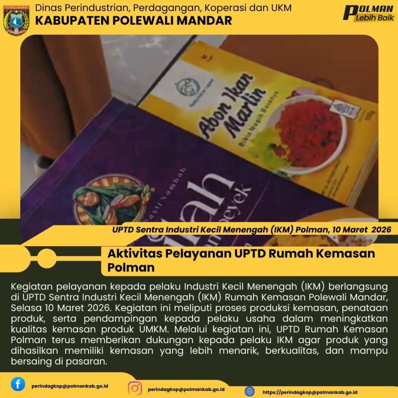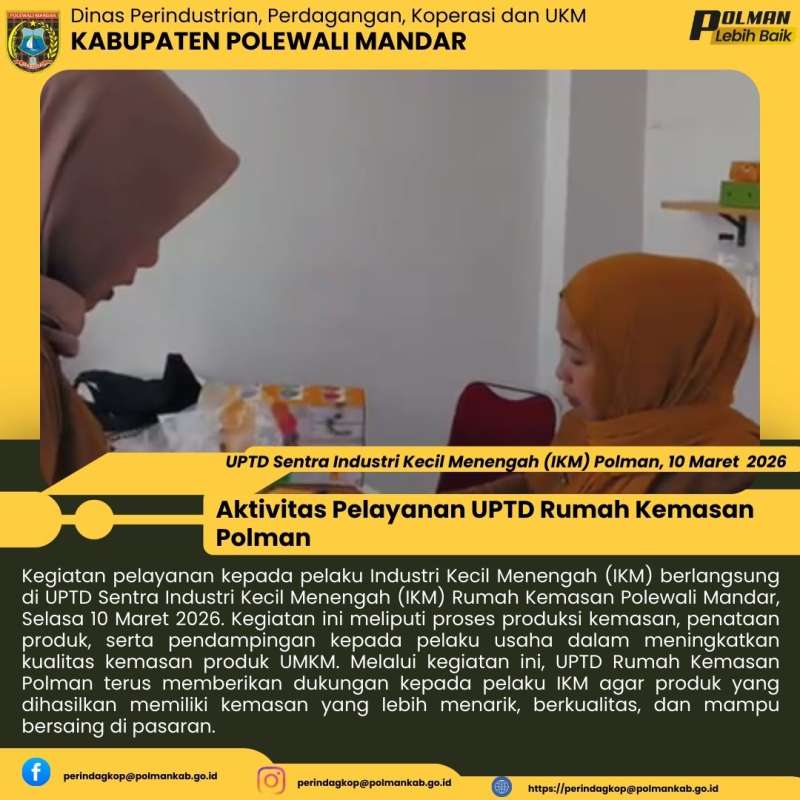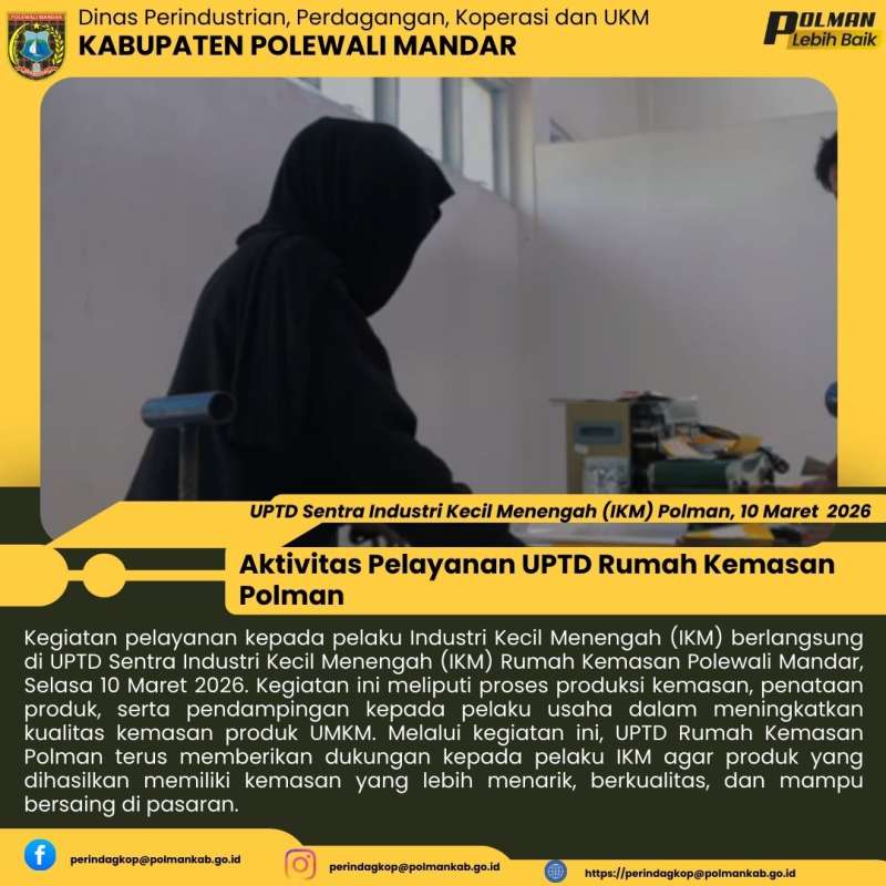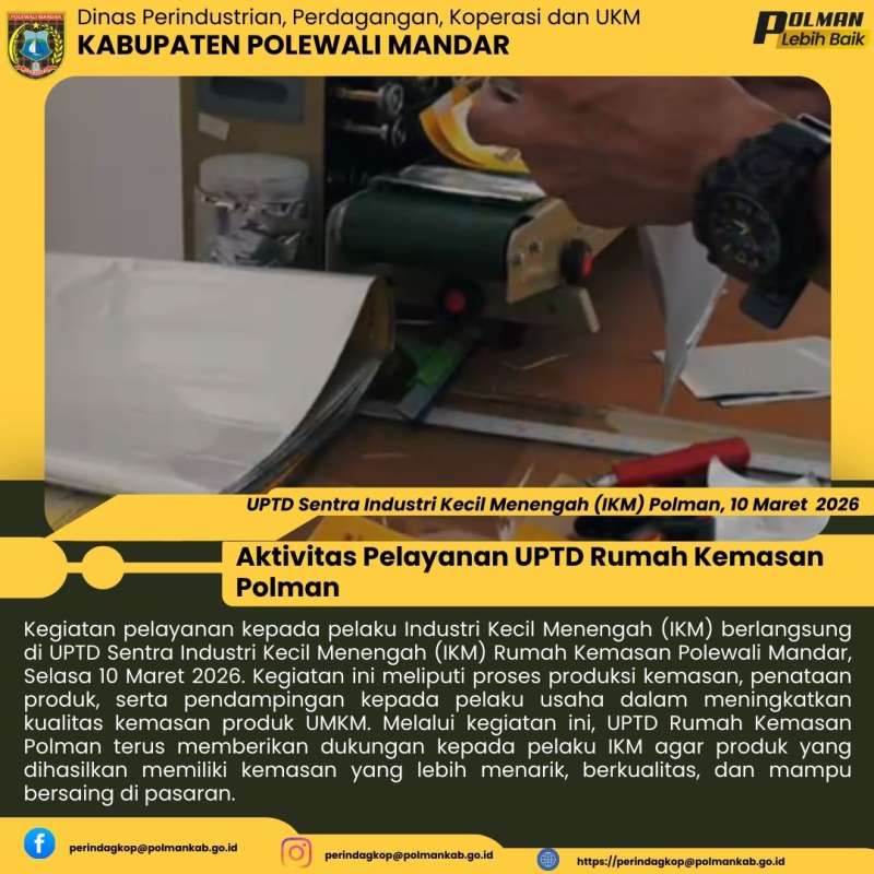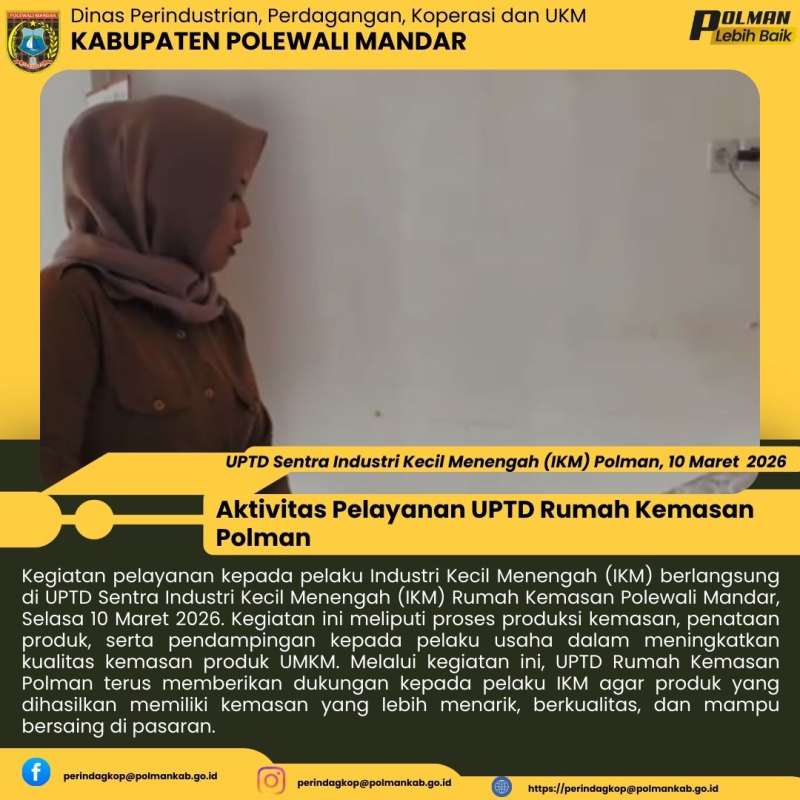 Kegiatan pelayanan kepada pelaku Industri Kecil Menengah (IKM) berlangsung di UPTD Sentra Industri Kecil Menengah (IKM) Rumah Kemasan Polewali Mandar, Selasa 10 Maret 2026. Kegiatan ini meliputi proses produksi kemasan, penataan produk, serta pendampingan kepada pelaku usaha dalam meningkatkan kualitas kemasan produk UMKM. Melalui kegiatan ini, UPTD Rumah Kemasan Polman terus memberikan dukungan kepada pelaku IKM agar produk yang dihasilkan memiliki kemasan yang lebih menarik, berkualitas, dan mampu bersaing di pasaran.