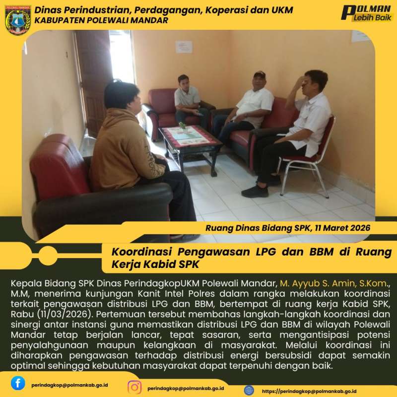 Kepala Bidang SPK Dinas PerindagkopUKM Polewali Mandar, M. Ayyub S. Amin, S.Kom., M.M, menerima kunjungan Kanit Intel Polres dalam rangka melakukan koordinasi terkait pengawasan distribusi LPG dan BBM, bertempat di ruang kerja Kabid SPK, Rabu (11/03/2026). Pertemuan tersebut membahas langkah-langkah koordinasi dan sinergi antar instansi guna memastikan distribusi LPG dan BBM di wilayah Polewali Mandar tetap berjalan lancar, tepat sasaran, serta mengantisipasi potensi penyalahgunaan maupun kelangkaan di masyarakat. Melalui koordinasi ini diharapkan pengawasan terhadap distribusi energi bersubsidi dapat semakin optimal sehingga kebutuhan masyarakat dapat terpenuhi dengan baik.