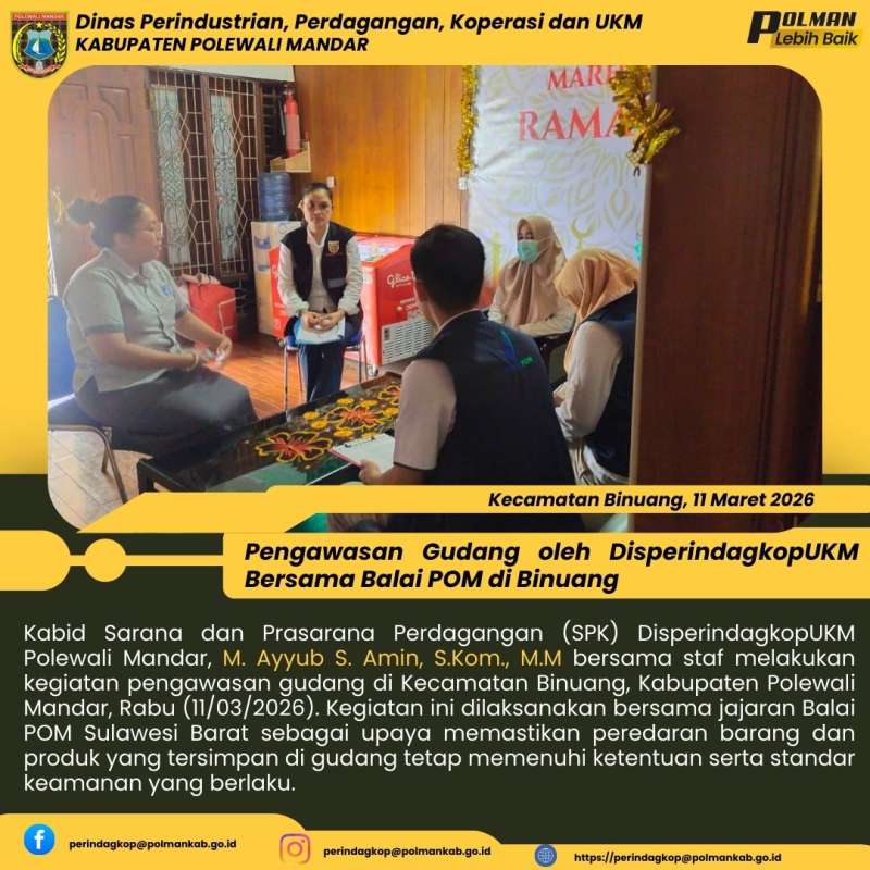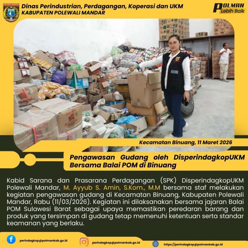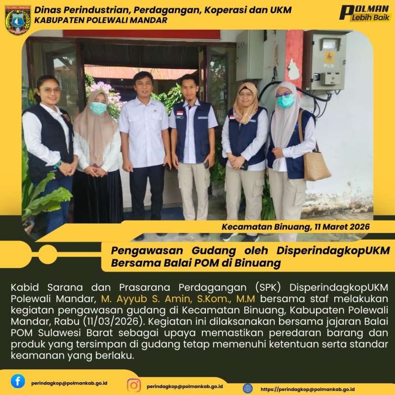 Kabid Sarana dan Prasarana Perdagangan (SPK) DisperindagkopUKM Polewali Mandar, M. Ayyub S. Amin, S.Kom., M.M bersama staf melakukan kegiatan pengawasan gudang di Kecamatan Binuang, Kabupaten Polewali Mandar, Rabu (11/03/2026). Kegiatan ini dilaksanakan bersama jajaran Balai POM Sulawesi Barat sebagai upaya memastikan peredaran barang dan produk yang tersimpan di gudang tetap memenuhi ketentuan serta standar keamanan yang berlaku.