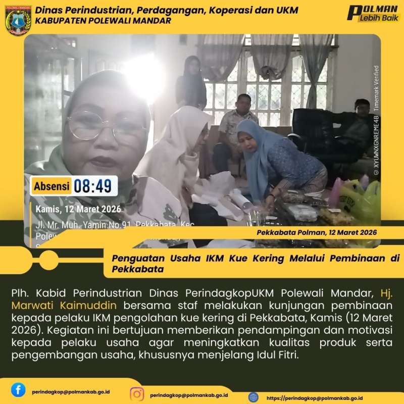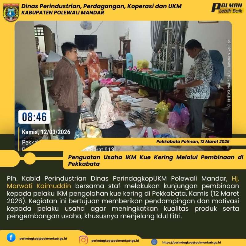 Plh. Kabid Perindustrian Dinas PerindagkopUKM Polewali Mandar, Hj. Marwati Kaimuddin bersama staf melakukan kunjungan pembinaan kepada pelaku IKM pengolahan kue kering di Pekkabata, Kamis (12 Maret 2026). Kegiatan ini bertujuan memberikan pendampingan dan motivasi kepada pelaku usaha agar meningkatkan kualitas produk serta pengembangan usaha, khususnya menjelang Idul Fitri.