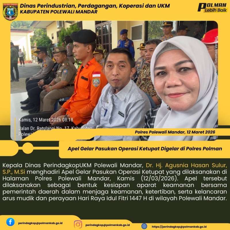 Kepala Dinas PerindagkopUKM Polewali Mandar, Dr. Hj. Agusnia Hasan Sulur, S.P., M.Si menghadiri Apel Gelar Pasukan Operasi Ketupat yang dilaksanakan di Halaman Polres Polewali Mandar, Kamis (12/03/2026). Apel tersebut dilaksanakan sebagai bentuk kesiapan aparat keamanan bersama pemerintah daerah dalam menjaga keamanan, ketertiban, serta kelancaran arus mudik dan perayaan Hari Raya Idul Fitri 1447 H di wilayah Polewali Mandar.