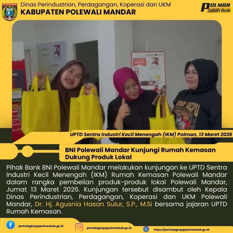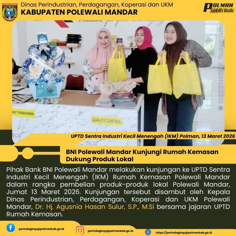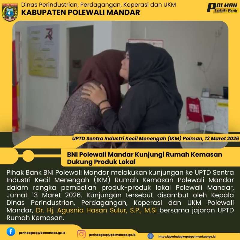 Pihak Bank BNI Polewali Mandar melakukan kunjungan ke UPTD Sentra Industri Kecil Menengah (IKM) Rumah Kemasan Polewali Mandar dalam rangka pembelian produk-produk lokal Polewali Mandar, Jumat 13 Maret 2026. Kunjungan tersebut disambut oleh Kepala Dinas Perindustrian, Perdagangan, Koperasi dan UKM Polewali Mandar, Dr. Hj. Agusnia Hasan Sulur, S.P., M.Si bersama jajaran UPTD Rumah Kemasan.