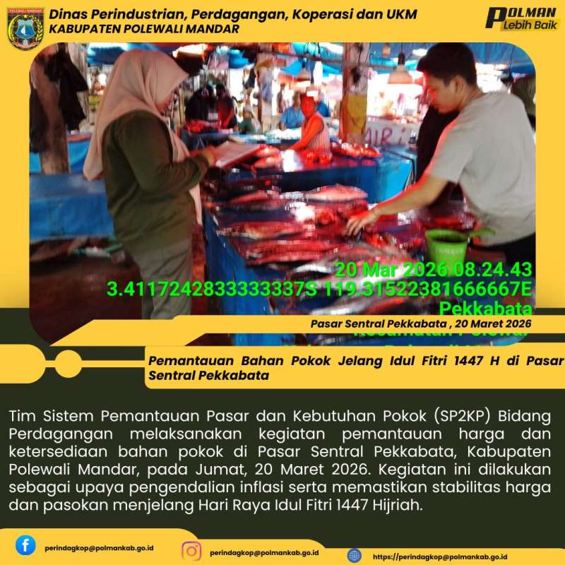 Tim Sistem Pemantauan Pasar dan Kebutuhan Pokok (SP2KP) Bidang Perdagangan melaksanakan kegiatan pemantauan harga dan ketersediaan bahan pokok di Pasar Sentral Pekkabata, Kabupaten Polewali Mandar, pada Jumat, 20 Maret 2026. Kegiatan ini dilakukan sebagai upaya pengendalian inflasi serta memastikan stabilitas harga dan pasokan menjelang Hari Raya Idul Fitri 1447 Hijriah.