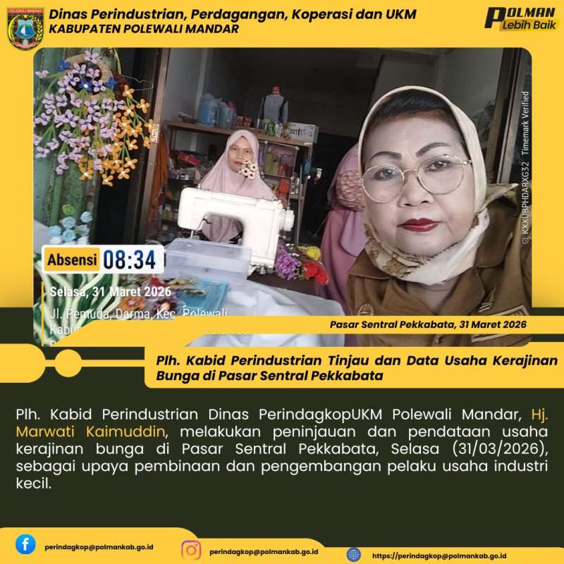 Plh. Kabid Perindustrian Dinas PerindagkopUKM Polewali Mandar, Hj. Marwati Kaimuddin, melakukan peninjauan dan pendataan usaha kerajinan bunga di Pasar Sentral Pekkabata, Selasa (31/03/2026), sebagai upaya pembinaan dan pengembangan pelaku usaha industri kecil....