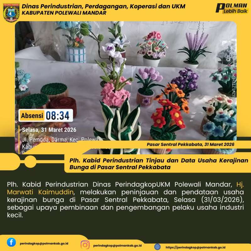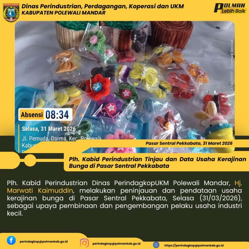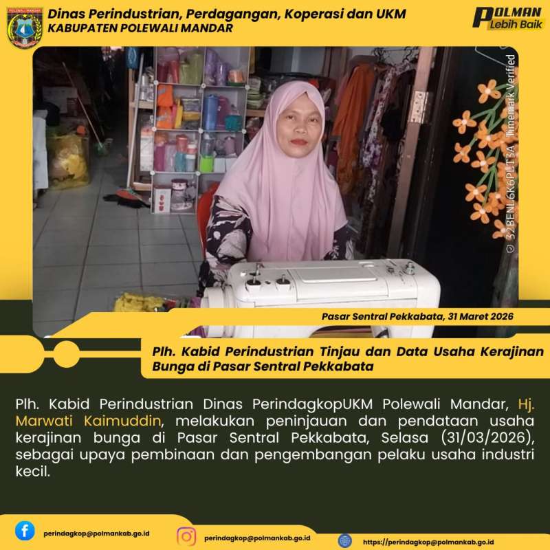 Plh. Kabid Perindustrian Dinas PerindagkopUKM Polewali Mandar, Hj. Marwati Kaimuddin, melakukan peninjauan dan pendataan usaha kerajinan bunga di Pasar Sentral Pekkabata, Selasa (31/03/2026), sebagai upaya pembinaan dan pengembangan pelaku usaha industri kecil.