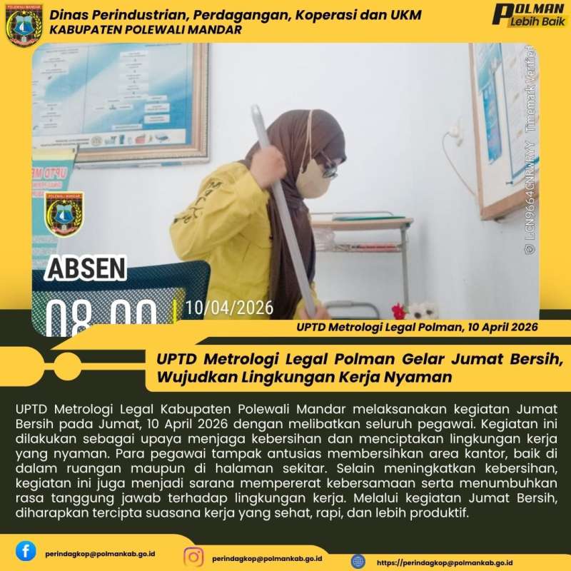 UPTD Metrologi Legal Kabupaten Polewali Mandar melaksanakan kegiatan Jumat Bersih pada Jumat, 10 April 2026 dengan melibatkan seluruh pegawai. Kegiatan ini dilakukan sebagai upaya menjaga kebersihan dan menciptakan lingkungan kerja yang nyaman. Para pegawai tampak antusias membersihkan area kantor, baik di dalam ruangan maupun di halaman sekitar. Selain meningkatkan kebersihan, kegiatan ini juga menjadi sarana mempererat kebersamaan serta menumbuhkan rasa tanggung jawab terhadap lingkungan kerja. Melalui kegiatan Jumat Bersih, diharapkan tercipta suasana kerja yang sehat, rapi, dan lebih produktif.
