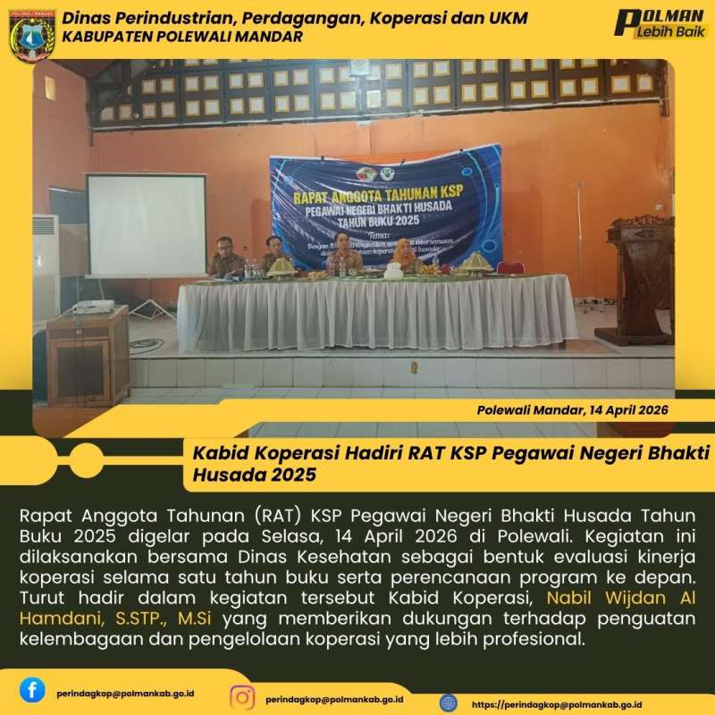 Rapat Anggota Tahunan (RAT) KSP Pegawai Negeri Bhakti Husada Tahun Buku 2025 digelar pada Selasa, 14 April 2026 di Polewali. Kegiatan ini dilaksanakan bersama Dinas Kesehatan sebagai bentuk evaluasi kinerja koperasi selama satu tahun buku serta perencanaan program ke depan. Turut hadir dalam kegiatan tersebut Kabid Koperasi, Nabil Wijdan Al Hamdani, S.STP., M.Si yang memberikan dukungan terhadap penguatan kelembagaan dan pengelolaan koperasi yang lebih profesional.