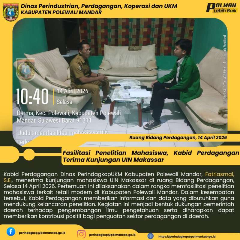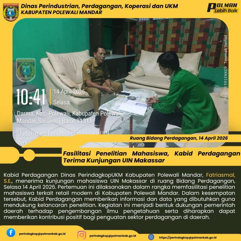 Kabid Perdagangan Dinas PerindagkopUKM Kabupaten Polewali Mandar, Fatriasmal, S.E., menerima kunjungan mahasiswa UIN Makassar di ruang Bidang Perdagangan, Selasa 14 April 2026. Pertemuan ini dilaksanakan dalam rangka memfasilitasi penelitian mahasiswa terkait retail modern di Kabupaten Polewali Mandar. Dalam kesempatan tersebut, Kabid Perdagangan memberikan informasi dan data yang dibutuhkan guna mendukung kelancaran penelitian. Kegiatan ini menjadi bentuk dukungan pemerintah daerah terhadap pengembangan ilmu pengetahuan serta diharapkan dapat memberikan kontribusi positif bagi penguatan sektor perdagangan di daerah....