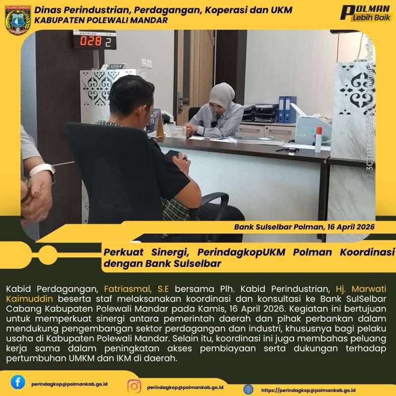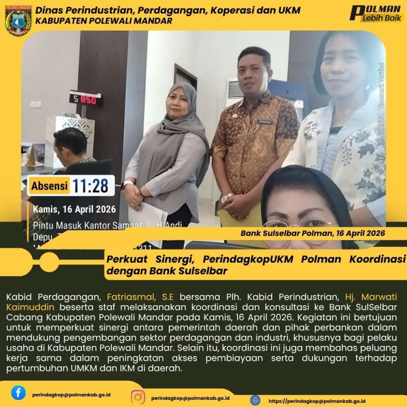 Kabid Perdagangan, Fatriasmal, S.E bersama Plh. Kabid Perindustrian, Hj. Marwati Kaimuddin beserta staf melaksanakan koordinasi dan konsultasi ke Bank SulSelbar Cabang Kabupaten Polewali Mandar pada Kamis, 16 April 2026. Kegiatan ini bertujuan untuk memperkuat sinergi antara pemerintah daerah dan pihak perbankan dalam mendukung pengembangan sektor perdagangan dan industri, khususnya bagi pelaku usaha di Kabupaten Polewali Mandar. Selain itu, koordinasi ini juga membahas peluang kerja sama dalam peningkatan akses pembiayaan serta dukungan terhadap pertumbuhan UMKM dan IKM di daerah.