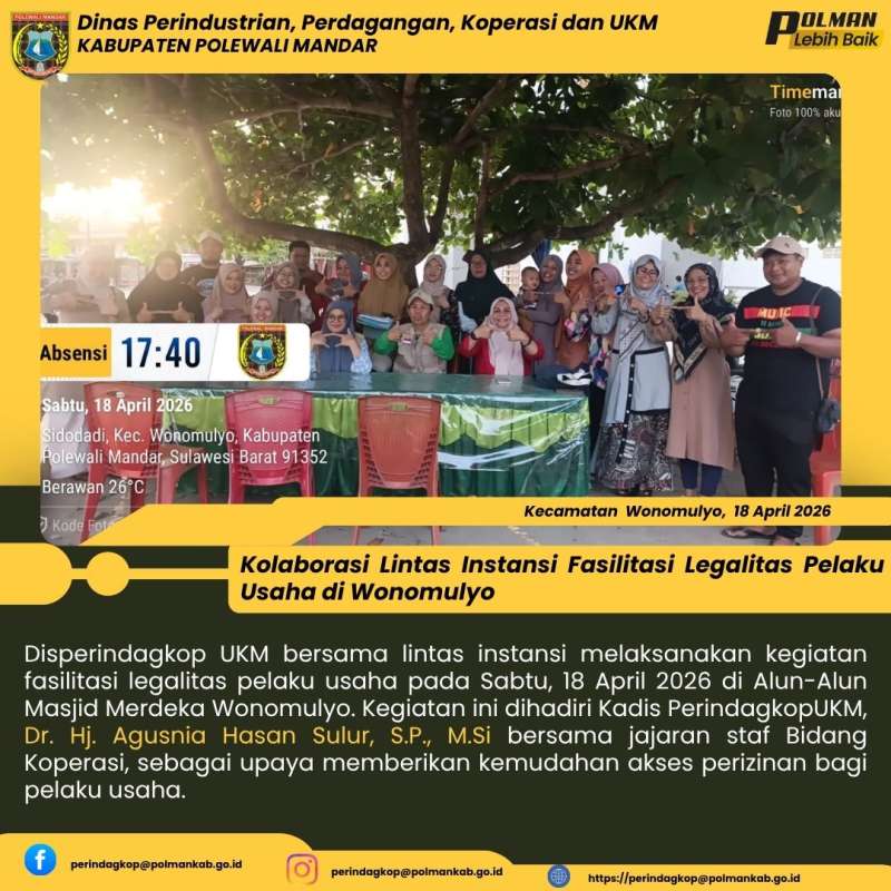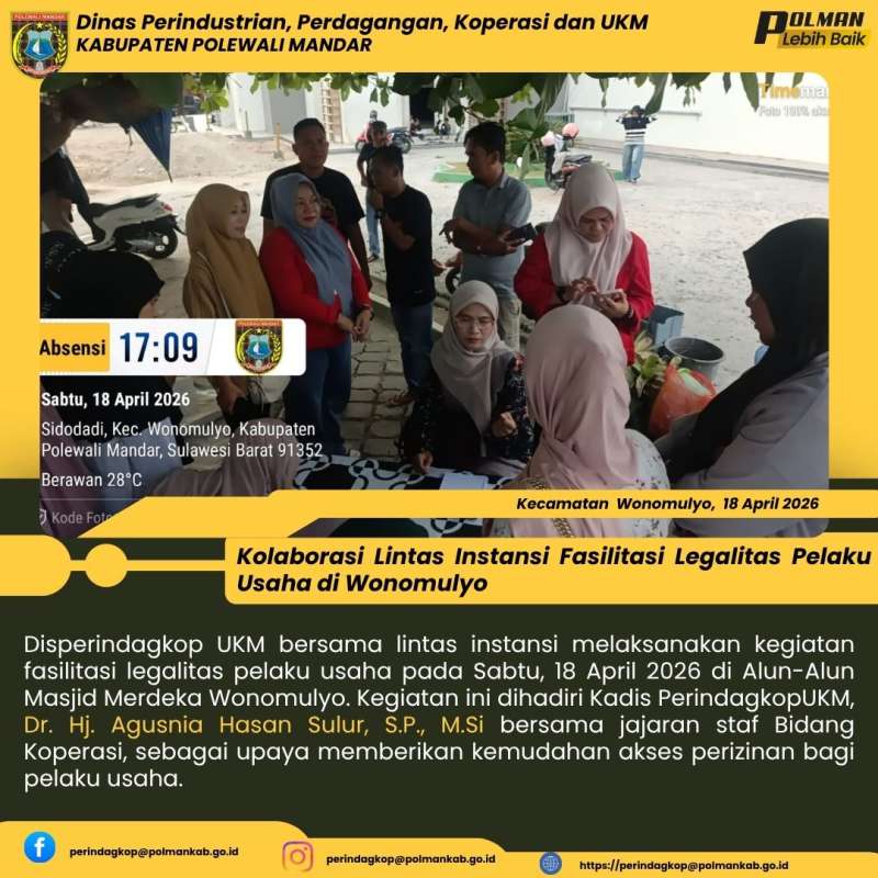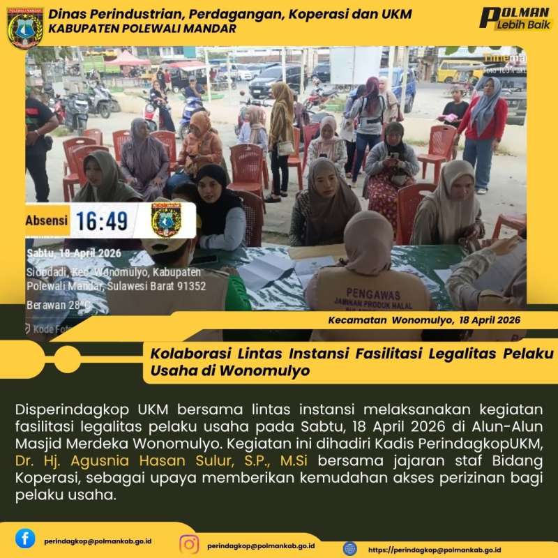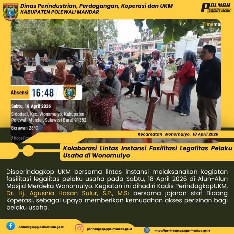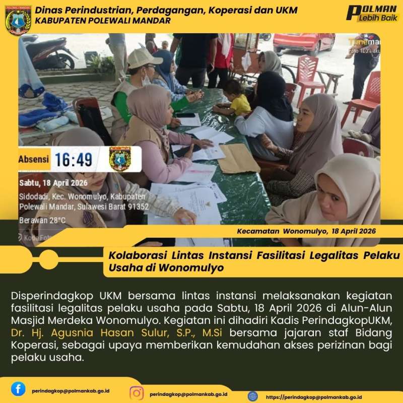 Disperindagkop UKM bersama lintas instansi melaksanakan kegiatan fasilitasi legalitas pelaku usaha pada Sabtu, 18 April 2026 di Alun-Alun Masjid Merdeka Wonomulyo. Kegiatan ini dihadiri Kadis PerindagkopUKM, Dr. Hj. Agusnia Hasan Sulur, S.P., M.Si bersama jajaran staf Bidang Koperasi, sebagai upaya memberikan kemudahan akses perizinan bagi pelaku usaha.