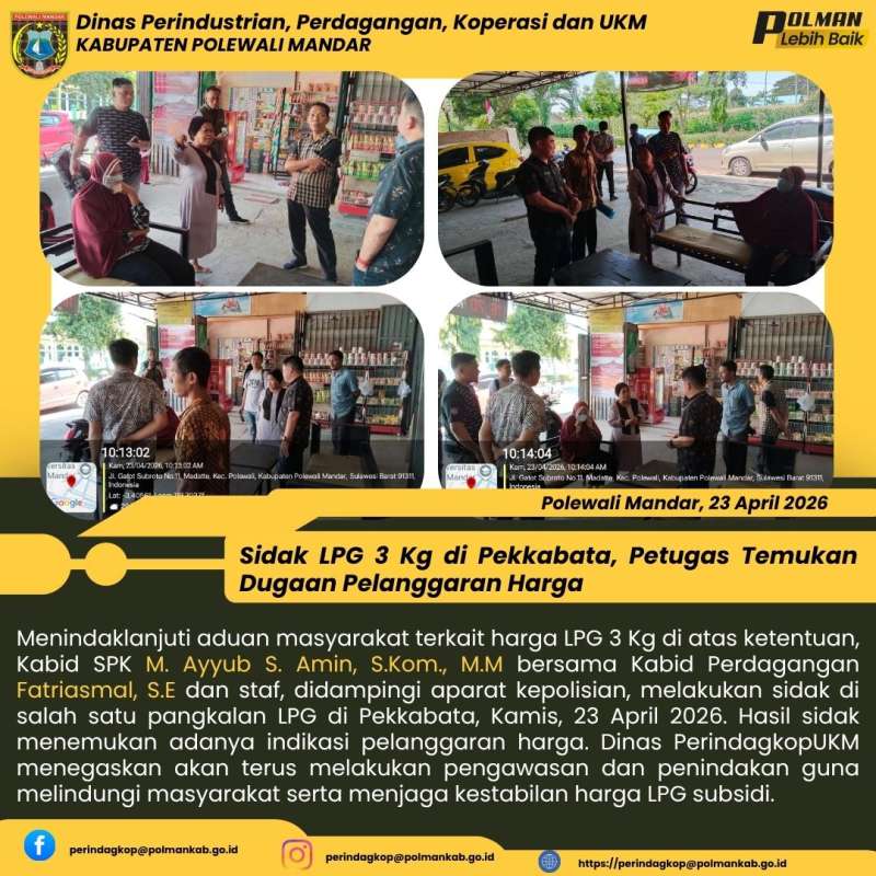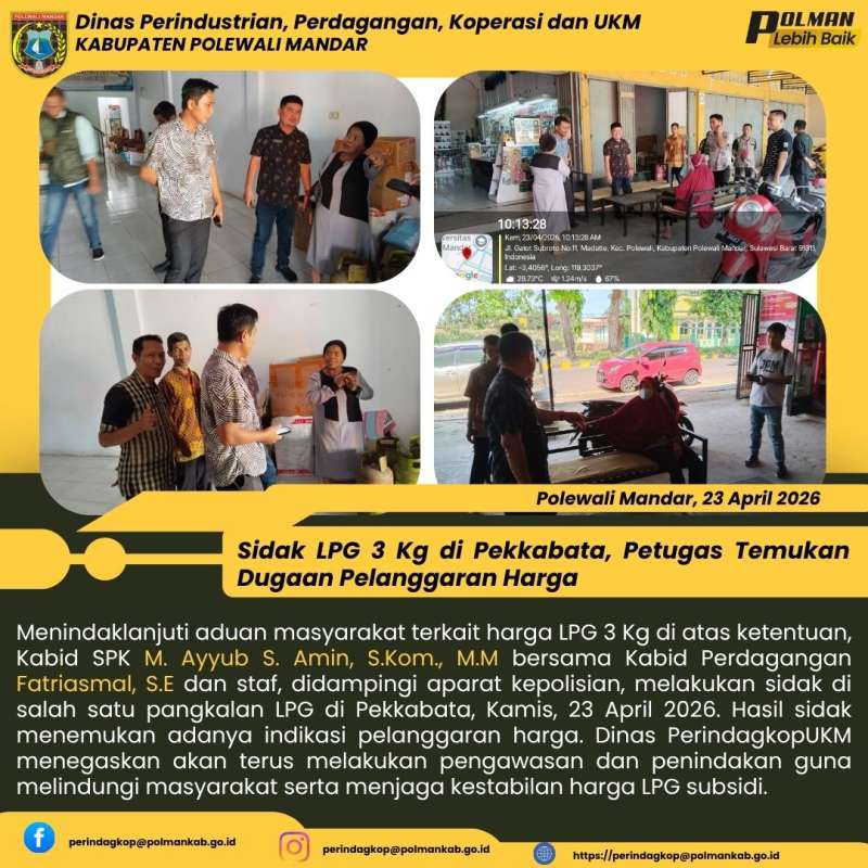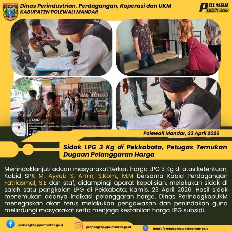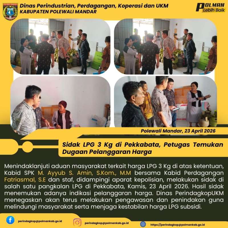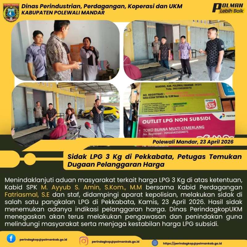 Menindaklanjuti aduan masyarakat terkait harga LPG 3 Kg di atas ketentuan, Kabid SPK M. Ayyub S. Amin, S.Kom., M.M bersama Kabid Perdagangan Fatriasmal, S.E dan staf, didampingi aparat kepolisian, melakukan sidak di salah satu pangkalan LPG di Pekkabata, Kamis, 23 April 2026. Hasil sidak menemukan adanya indikasi pelanggaran harga. Dinas PerindagkopUKM menegaskan akan terus melakukan pengawasan dan penindakan guna melindungi masyarakat serta menjaga kestabilan harga LPG subsidi.
